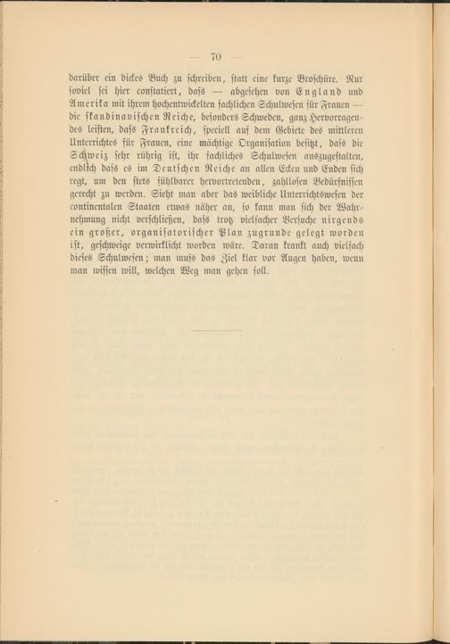 darüber ein dickes Buch zu schreiben, statt eine kurze Broschüre. Nur soviel sei hier konstatiert, dass — abgesehen von England und Amerika mit ihrem hochentwickelten sachlichen Schulwesen sür Frauen — die skandinavischen Reiche, besonders Schweden, ganz Hervorragendes leisten, dass Frankreich, speciell aus dem Gebiete des mittleren Unterrichtes sür Frauen, eine mächtige Organisation besitzt, dass die Schweiz sehr rührig ist, ihr sachliches Schulwesen auszugestalten, endlich dass es im Deutschen Reiche an allen Ecken und Enden sich regt, um den stets sichtbarer hervortretenden, zahllosen Bedürfnissen gerecht zu werden. Sieht man aber das weibliche Unterrichtswesen der kontinentalen Staaten etwas näher an, so kann man sich der Wahrnehmung nicht verschließen, dass trotz vielfacher Bersuche nirgends ein großer, organisatorischer Plan zugrunde gelegt worden ist, geschweige verwirklicht worden wäre. Daran krankt auch vielfach dieses Schulwesen; man muss das Ziel klar vor Augen haben, wenn man wissen will, welchen Weg man gehen soll.