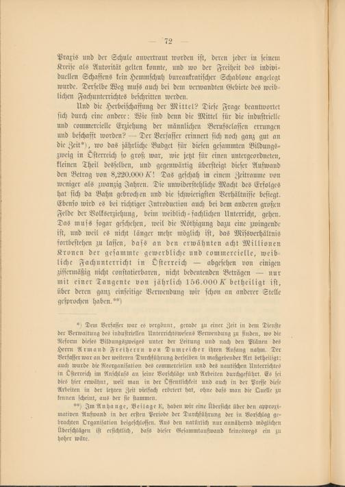 *) Dem Verfasser war es vergönnt, gerade zu einer Zeit in dem Dienste der Verwaltung des industriellen Unterrichtswesens Verwendung zu finden, wo die Reform dieses Bildungszweiges unter der Leitung und nach den Plänen des .Herrn Armand Freiherrn von Dumreicher ihren Anfang nahm. Der Verfasser war an der weiteren Durchführung derselben in maßgebender Art betheiligt; auch wurde die Reorganisation des commereiellen und des nautischen Unterrichtes in Österreich im Anschluss an seine Vorschläge und Arbeiten durchgeführt. Es sei dies hier erwähnt, weil man in der Öffentlichkeit und auch in der Presse diese Arbeiten in der letzten Zeit vielfach erörtert hat, ohne dass man die Quelle zu kennen scheint, aus der sie stammen.