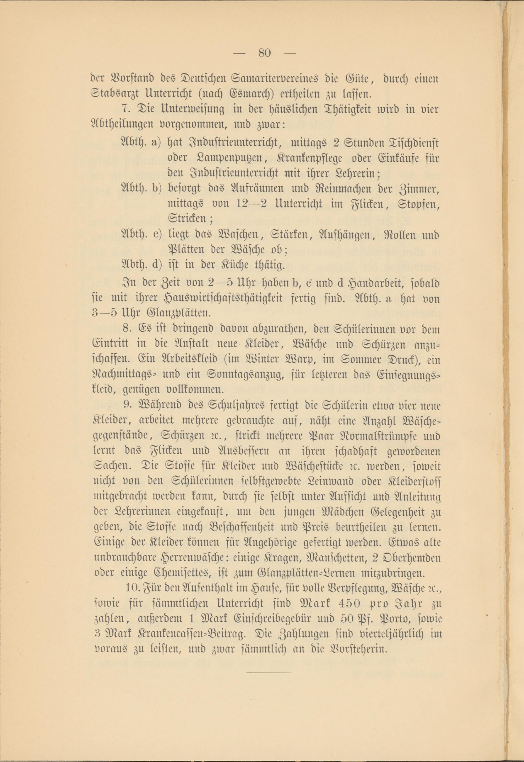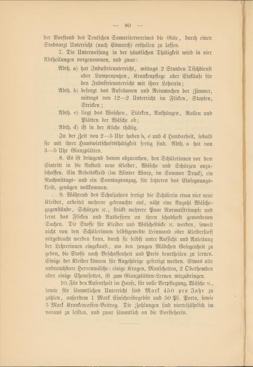 8. Es ist dringend davon abzurathen, den Schülerinnen vor dem Eintritt in die Anstalt neue Kleider, Wäsche und Schürzen anzuschaffen. Ein Arbeitskleid (im Winter Warp, im Sommer Druck), ein Nachmittags- und ein Sonntagsanzug, für letzteren das Einsegnungs- kleid, genügen vollkommen.