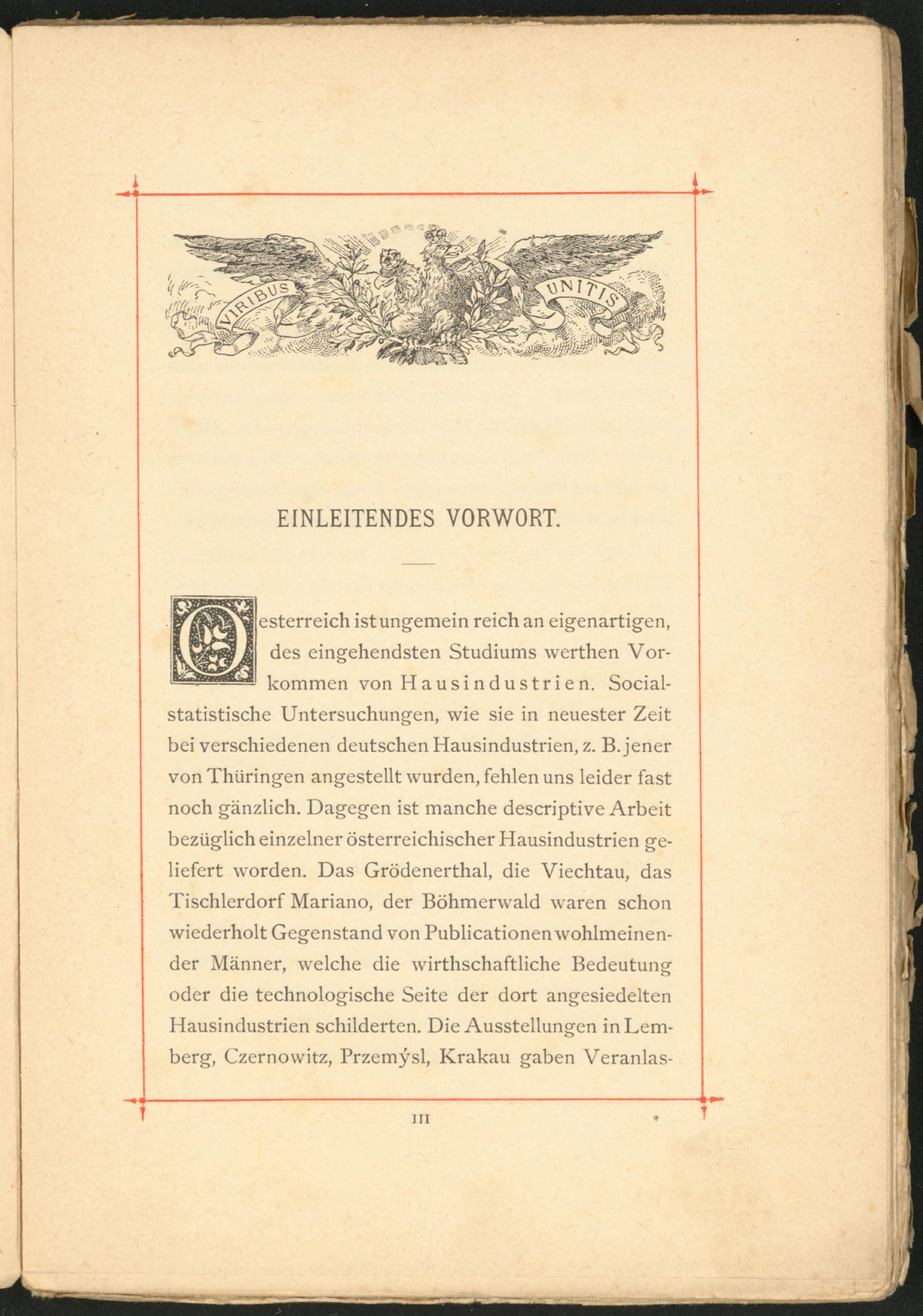 esterreich ist ungemein reich an eigenartigen, des eingehendsten Studiums werthen Vorkommen von Hausindustrien. Socialstatistische Untersuchungen, wie sie in neuester Zeit bei verschiedenen deutschen Hausindustrien, z. B. jener von Thüringen angestellt wurden, fehlen uns leider fast noch gänzlich. Dagegen ist manche descriptive Arbeit bezüglich einzelner österreichischer Hausindustrien geliefert worden. Das Grödenerthal, die Viechtau, das Tischlerdorf Mariano, der Böhmerwald waren schon wiederholt Gegenstand von Publicationen wohlmeinender Männer, welche die wirthschaftliche Bedeutung oder die technologische Seite der dort angesiedelten Hausindustrien schilderten. Die Ausstellungen in Lemberg, Czernowitz, Przemysl, Krakau gaben Veranlas-