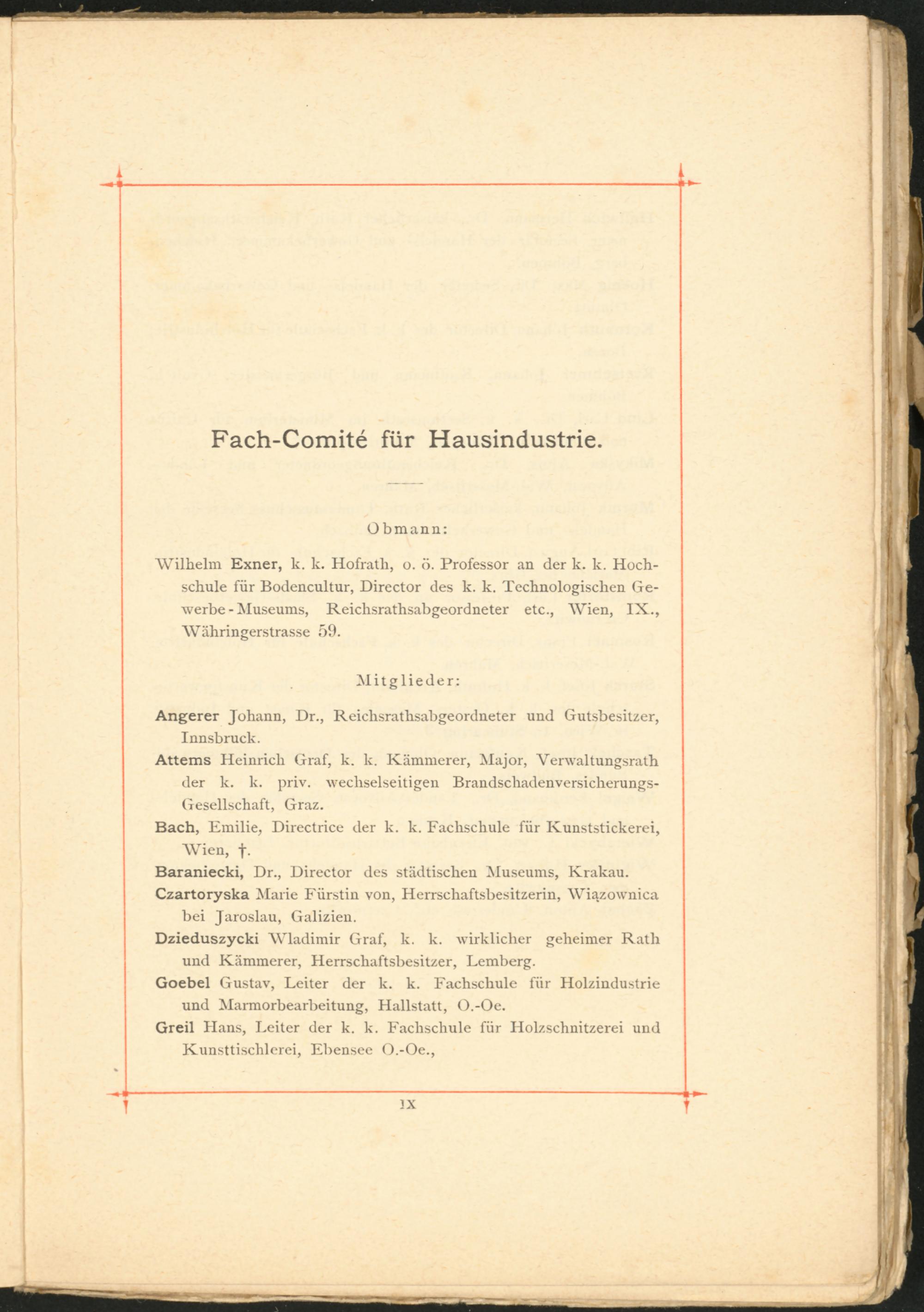 Wilhelm Exner, k. k. Hofratli, o. ö. Professor an der k. k. Hochschule für Bodencultur, Director des k. k. Technologischen Gewerbe-Museums, Reichsrathsabgeordneter etc., Wien, IX., Währingerstrasse 59.