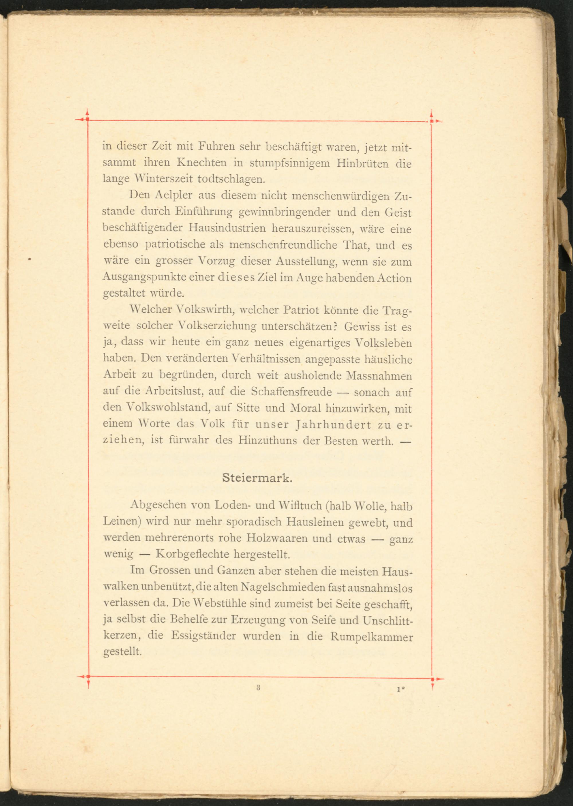 Welcher Volkswirth, welcher Patriot könnte die Trag­weite solcher Volkserziehung unterschätzen? Gewiss ist es ja, dass wir heute ein ganz neues eigenartiges Volksleben haben. Den veränderten Verhältnissen angepasste häusliche Arbeit zu begründen, durch weit ausholende Massnahmen auf die Arbeitslust, auf die Schaffensfreude sonach auf den Volkswohlstand, auf Sitte und Moral hinzuwirken, mit einem Worte das Volk für unser Jahrhundert zu er­ziehen, ist fürwahr des Hinzuthuns der Besten werth.