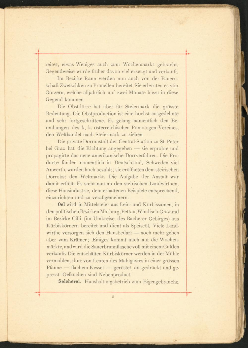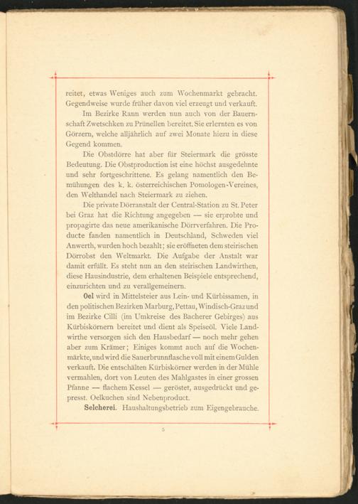 Die Obst dörre hat aber für Steiermark die grösste Bedeutung. Die Obstproduction ist eine höchst ausgedehnte und sehr fortgeschrittene. Es gelang namentlich den Be­mühungen des k. k. österreichischen Pomologen-Vereines, den Welthandel nach Steiermark zu ziehen.