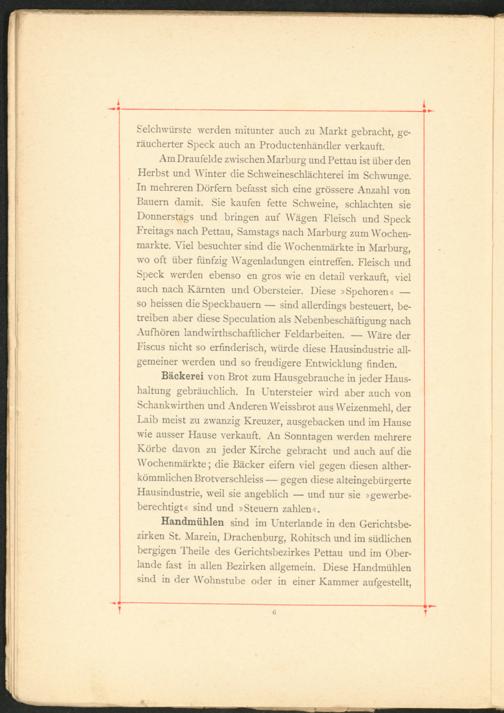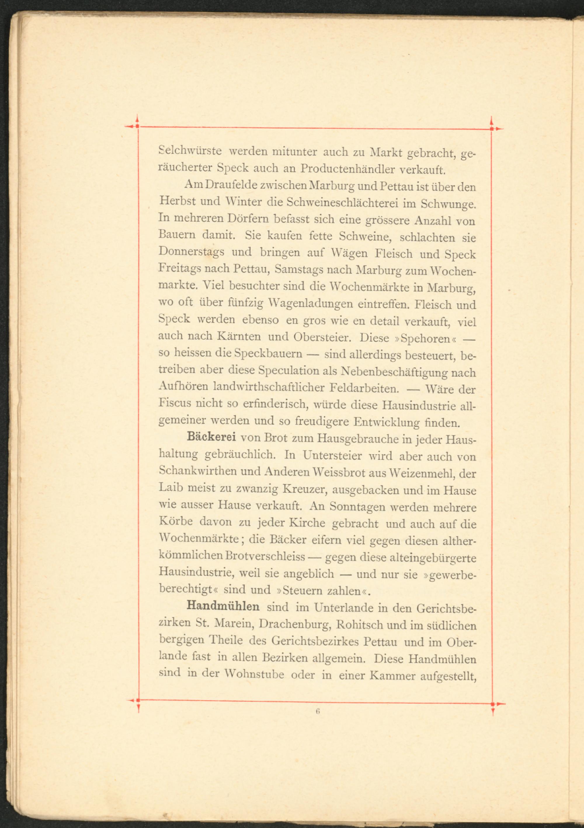 Am Draufelde zwischen Marburg und Pettau ist über den Herbst und Winter die Schweineschlächterei im Schwünge. In mehreren Dörfern befasst sich eine grössere Anzahl von Bauern damit. Sie kaufen fette Schweine, schlachten sie Donnerstags und bringen auf Wägen Fleisch und Speck Freitags nach Pettau, Samstags nach Marburg zum Wochen­markte. Viel besuchter sind die Wochenmärkte in Marburg, wo oft über fünfzig Wagenladungen eintreffen. Fleisch und Speck werden ebenso en gros wie en detail verkauft, viel auch nach Kärnten und Obersteier. Diese »Spehoren« so heissen die Speckbauern sind allerdings besteuert, be­treiben aber diese Speculation als Nebenbeschäftigung nach Aufhören landwirthschaftlicher Feldarbeiten. Wäre der Fiscus nicht so erfinderisch, würde diese Hausindustrie all­gemeiner werden und so freudigere Entwicklung finden.