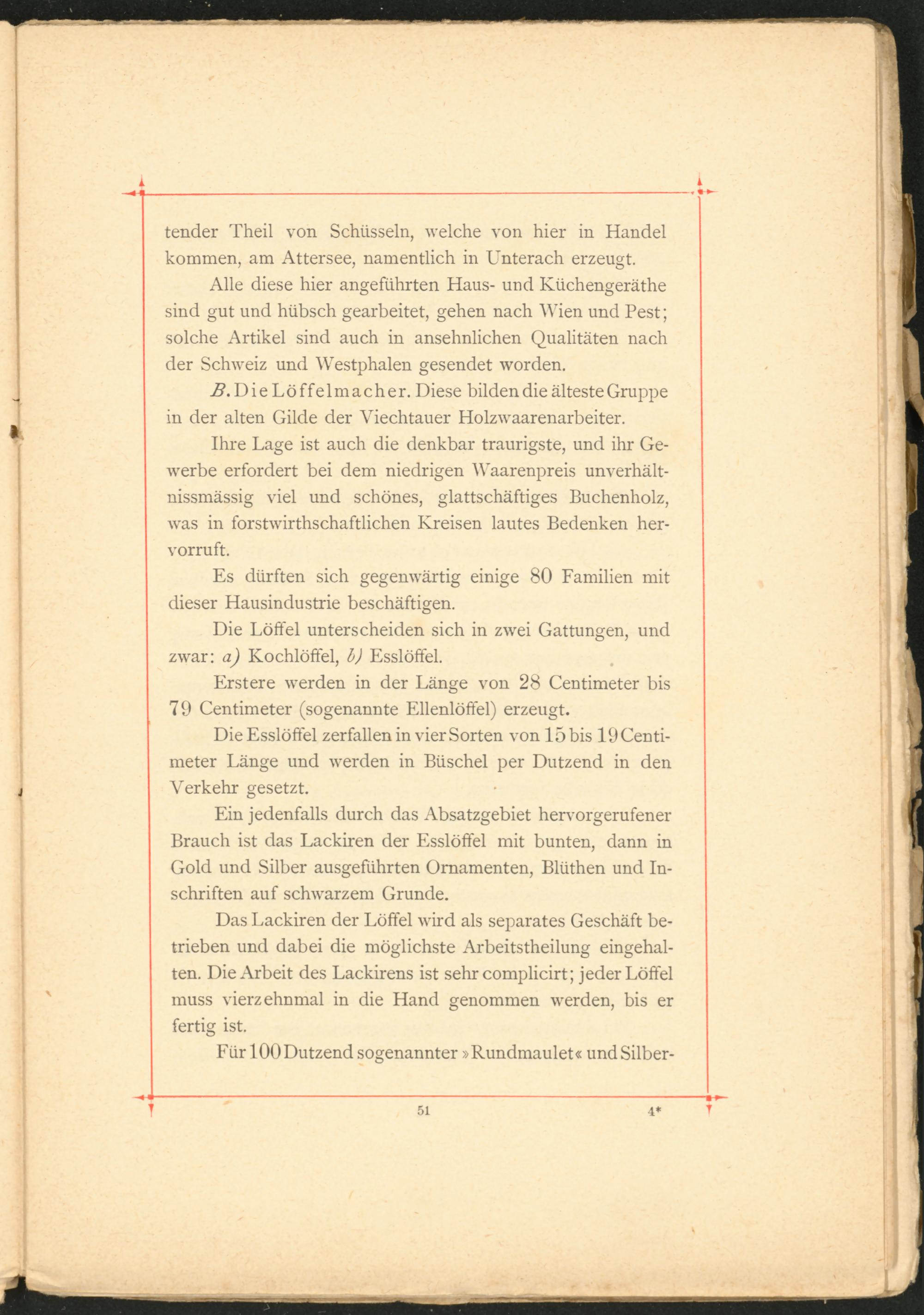 Ihre Lage ist auch die denkbar traurigste, und ihr Gewerbe erfordert bei dem niedrigen Waarenpreis unverhält- nissmässig viel und schönes, glattschäftiges Buchenholz, was in forstwirthschaftlichen Kreisen lautes Bedenken hervorruft.
