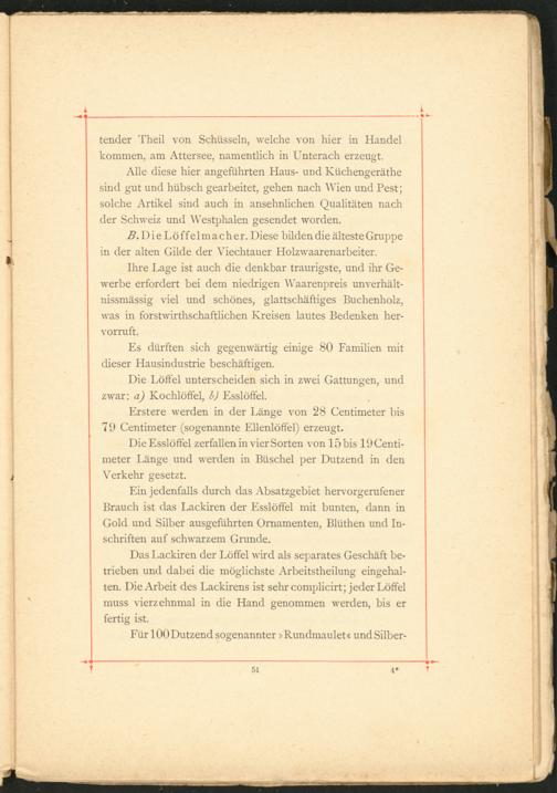 Ein jedenfalls durch das Absatzgebiet hervorgerufener Brauch ist das Lackiren der Esslöffel mit bunten, dann in Gold und Silber ausgeführten Ornamenten, Blüthen und Inschriften auf schwarzem Grunde.