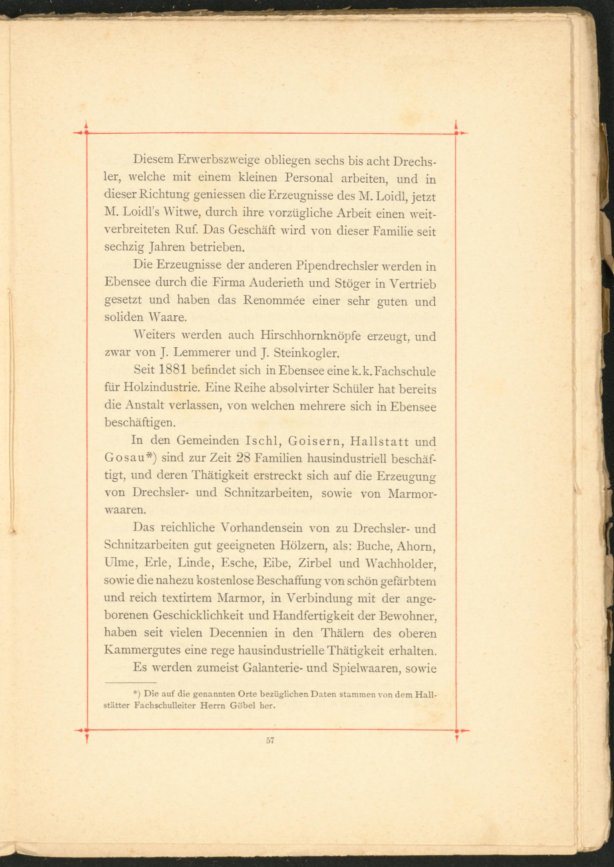 In den Gemeinden Ischl, Goisern, Hallstatt und Go sau*) sind zur Zeit 28 Familien hausindustriell beschäftigt, und deren Thätigkeit erstreckt sich auf die Erzeugung von Drechsler- und Schnitzarbeiten, sowie von Marmor- waaren.