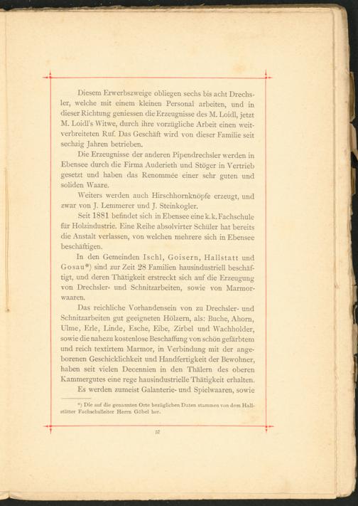 Das reichliche Vorhandensein von zu Drechsler- und Schnitzarbeiten gut geeigneten Hölzern, als: Buche, Ahorn, Ulme, Erle, Linde, Esche, Eibe, Zirbel und Wachholder, sowie die nahezu kostenlose Beschaffung von schön gefärbtem und reich textirtem Marmor, in Verbindung mit der angeborenen Geschicklichkeit und Handfertigkeit der Bewohner, haben seit vielen Decennien in den Thälern des oberen Kammergutes eine rege hausindustrielle Thätigkeit erhalten.
