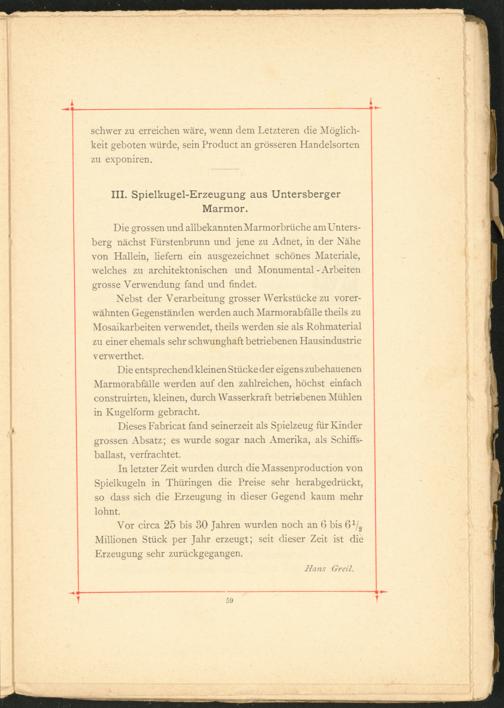 In letzter Zeit wurden durch die Massenproduction von Spielkugeln in Thüringen die Preise sehr herabgedrückt, so dass sich die Erzeugung in dieser Gegend kaum mehr lohnt.