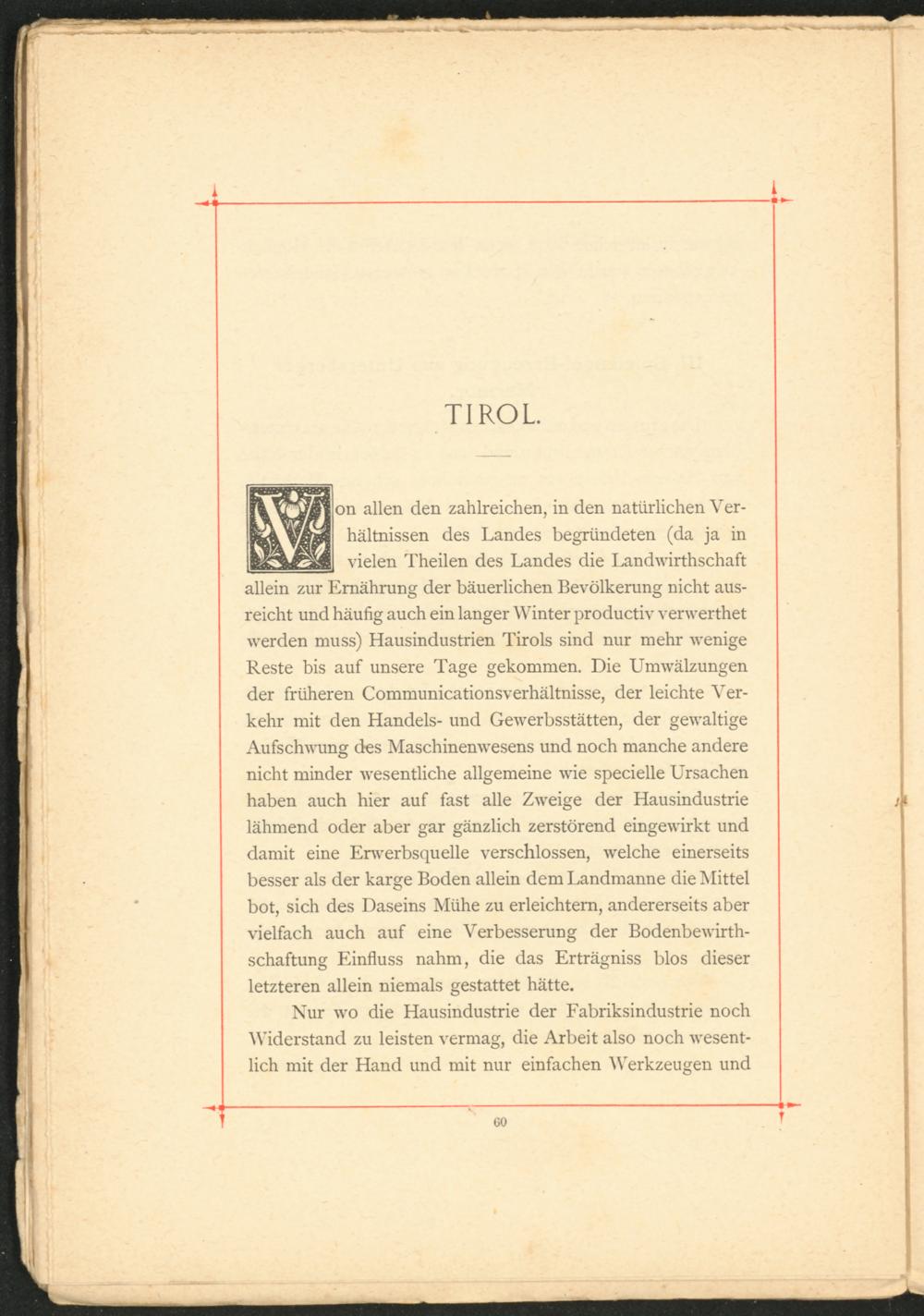 on allen den zahlreichen, in den natürlichen Verhältnissen des Landes begründeten (da ja in vielen Theilen des Landes die Landwirtschaft allein zur Ernährung der bäuerlichen Bevölkerung nicht ausreicht und häufig auch ein langer Winter productiv verwertet werden muss) Hausindustrien Tirols sind nur mehr wenige Reste bis auf unsere Tage gekommen. Die Umwälzungen der früheren Communicationsverhältnisse, der leichte Verkehr mit den Handels- und Gewerbsstätten, der gewaltige Aufschwung des Maschinenwesens und noch manche andere nicht minder wesentliche allgemeine wie specielle Ursachen haben auch hier auf fast alle Zweige der Hausindustrie lähmend oder aber gar gänzlich zerstörend eingewirkt und damit eine Erwerbsquelle verschlossen, welche einerseits besser als der karge Boden allein dem Landmanne die Mittel bot, sich des Daseins Mühe zu erleichtern, andererseits aber vielfach auch auf eine Verbesserung der Bodenbewirth- schaftung Einfluss nahm, die das Erträgniss blos dieser letzteren allein niemals gestattet hätte.