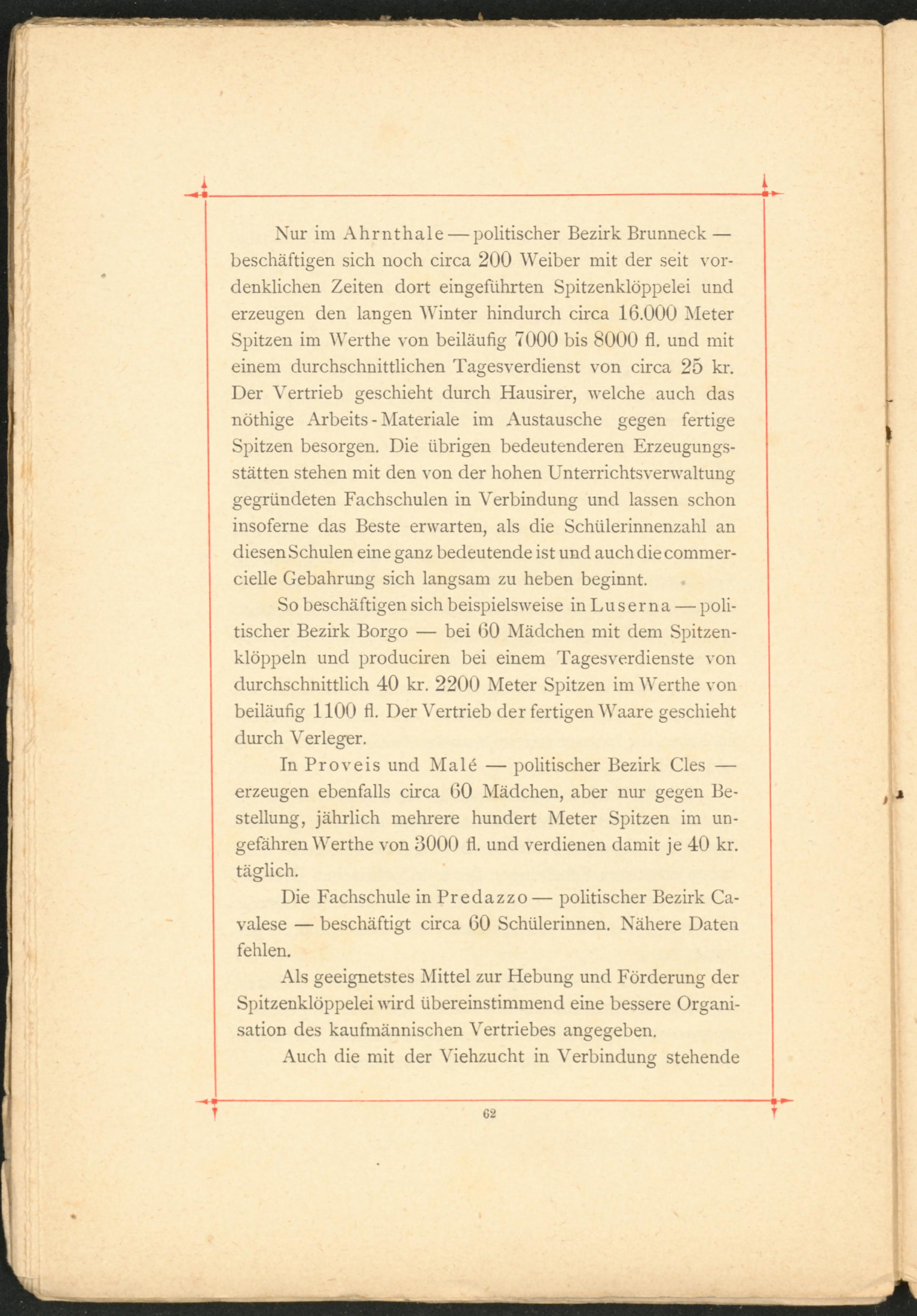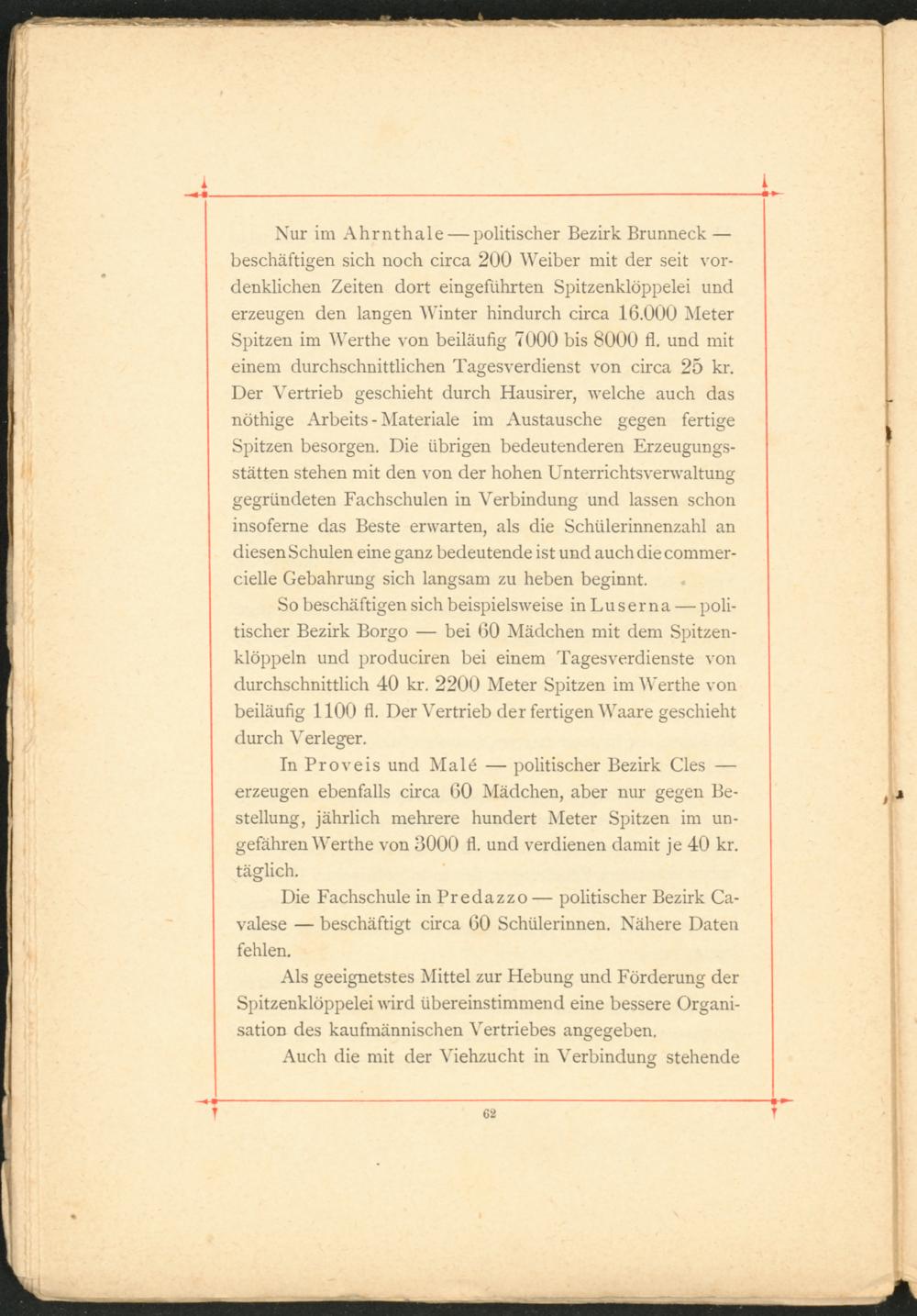 In Proveis und Maid — politischer Bezirk Cles — erzeugen ebenfalls circa 60 Mädchen, aber nur gegen Bestellung, jährlich mehrere hundert Meter Spitzen im ungefähren Werthe von 3000 fl. und verdienen damit je 40 kr. täglich.