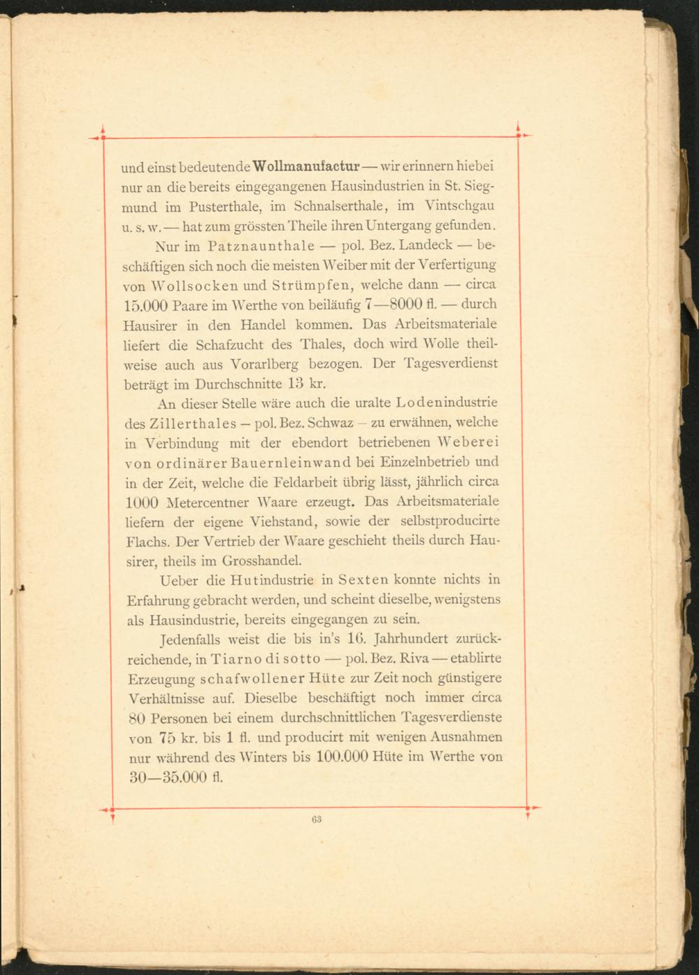 An dieser Stelle wäre auch die uralte Lodenindustrie des Zillerthales — pol.Bez. Schwaz — zu erwähnen, welche in Verbindung mit der ebendort betriebenen Weberei von ordinärer Bauernleinwand bei Einzelnbetrieb und in der Zeit, welche die Feldarbeit übrig lässt, jährlich circa 1000 Metercentner Waare erzeugt. Das Arbeitsmateriale liefern der eigene Viehstand, sowie der selbstproducirte Flachs. Der Vertrieb der Waare geschieht theils durch Hausirer, theils im Grosshandel.