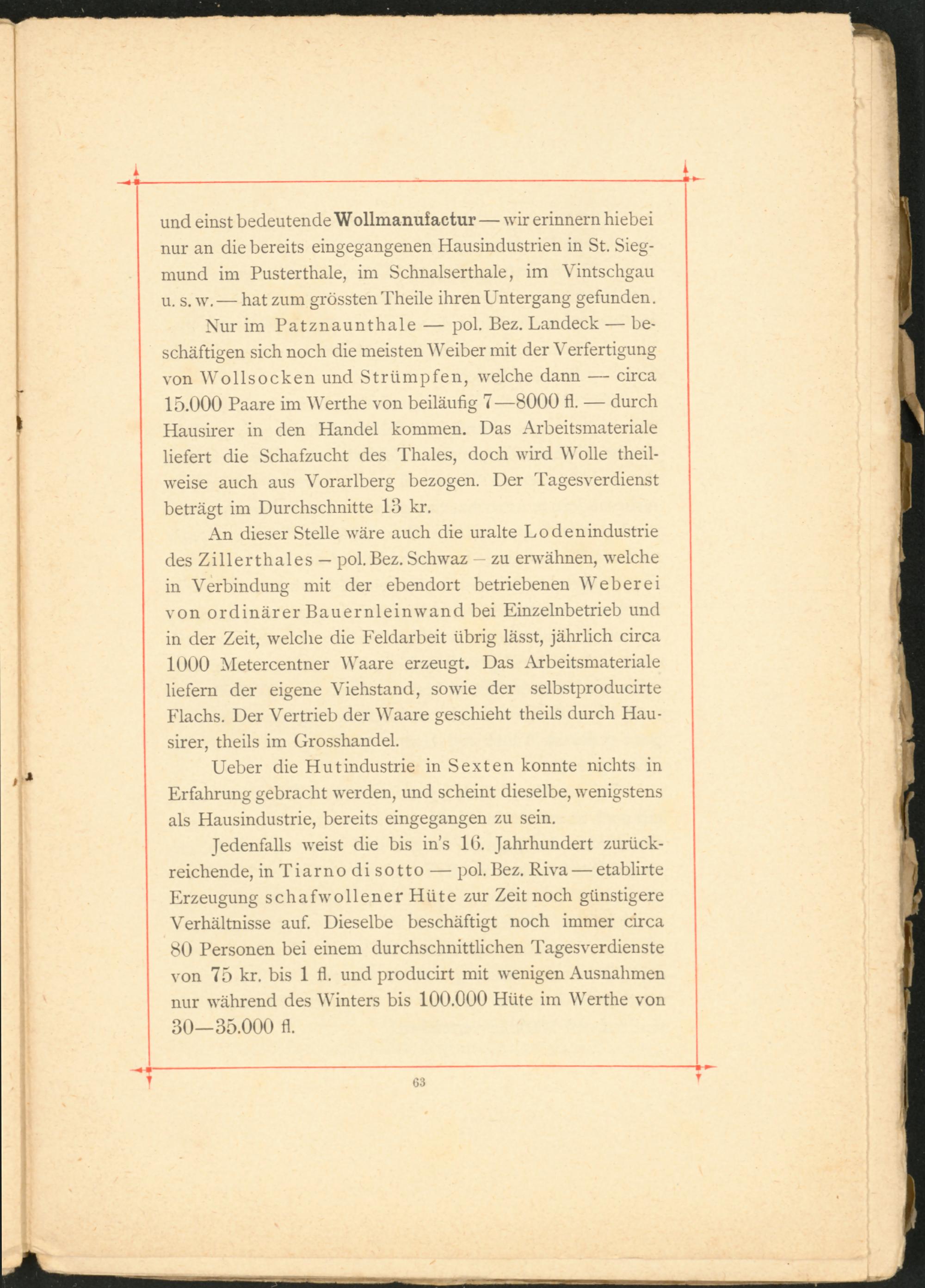 Nur im Patznaunthale — pol. Bez. Landeck — beschäftigen sich noch die meisten Weiber mit der Verfertigung von Wollsocken und Strümpfen, welche dann — circa 15.000 Paare im Werthe von beiläufig 7—8000 fl. — durch Hausirer in den Handel kommen. Das Arbeitsmateriale liefert die Schafzucht des Thaies, doch wird Wolle theil- weise auch aus Vorarlberg bezogen. Der Tagesverdienst beträgt im Durchschnitte 18 kr.