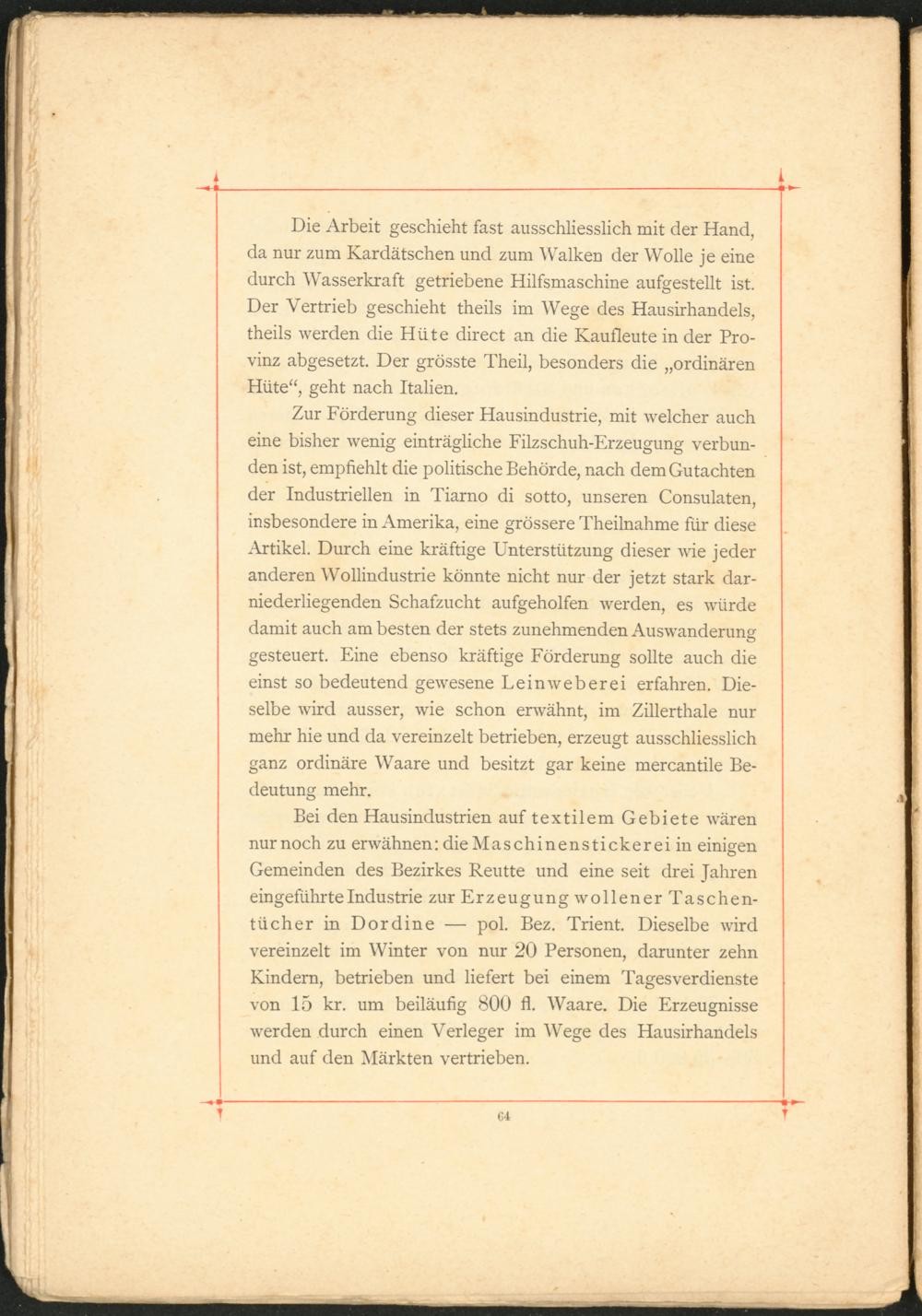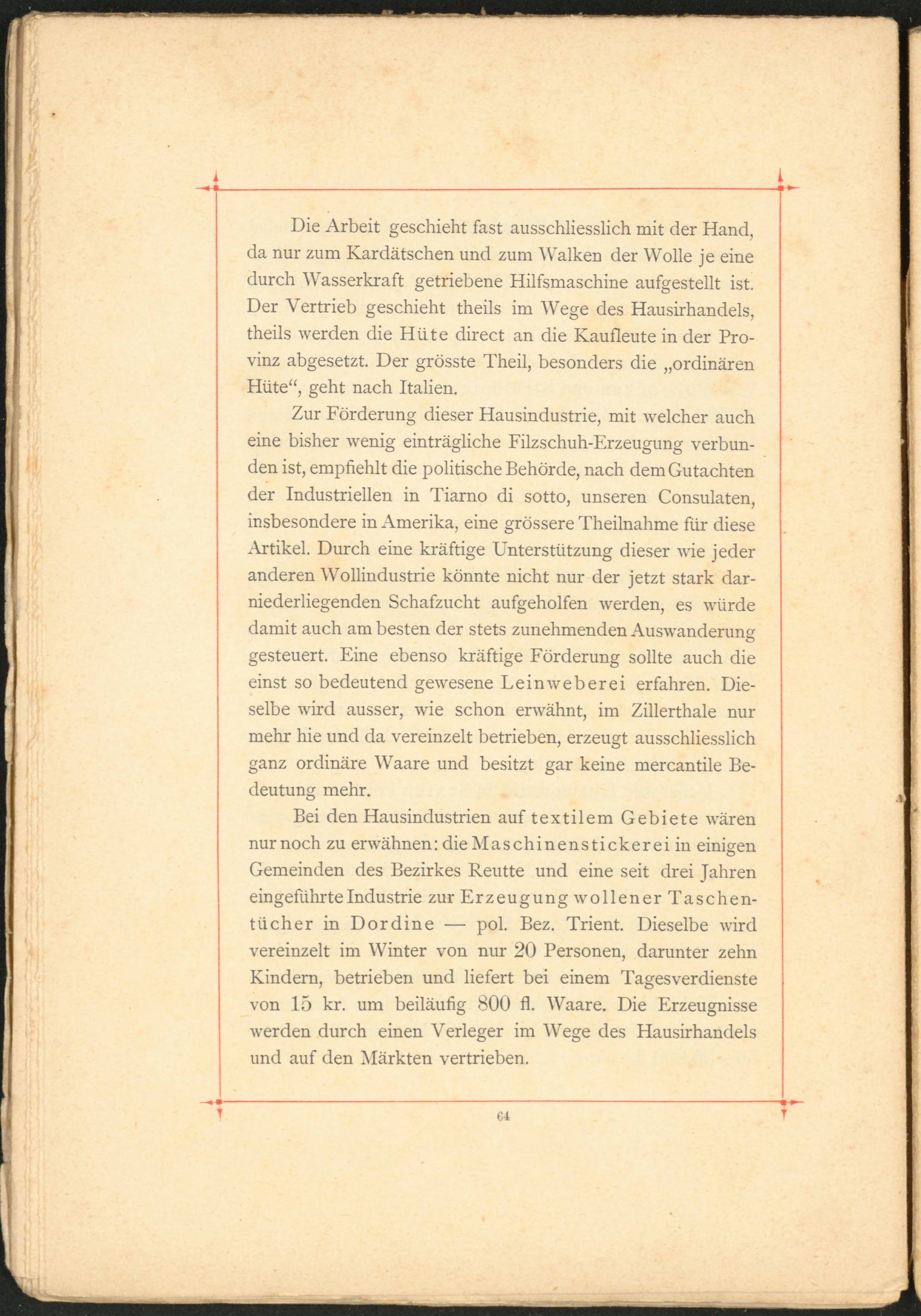 Zur Förderung dieser Hausindustrie, mit welcher auch eine bisher wenig einträgliche Filzschuh-Erzeugung verbunden ist, empfiehlt die politische Behörde, nach dem Gutachten der Industriellen in Tiarno di sotto, unseren Consulaten, insbesondere in Amerika, eine grössere Theilnahme für diese Artikel. Durch eine kräftige Unterstützung dieser wie jeder anderen Wollindustrie könnte nicht nur der jetzt stark darniederliegenden Schafzucht aufgeholfen werden, es würde damit auch am besten der stets zunehmenden Auswanderung gesteuert. Eine ebenso kräftige Förderung sollte auch die einst so bedeutend gewesene Leinweberei erfahren. Dieselbe wird ausser, wie schon erwähnt, im Zillerthale nur mehr hie und da vereinzelt betrieben, erzeugt ausschliesslich ganz ordinäre Waare und besitzt gar keine mercantile Bedeutung mehr.