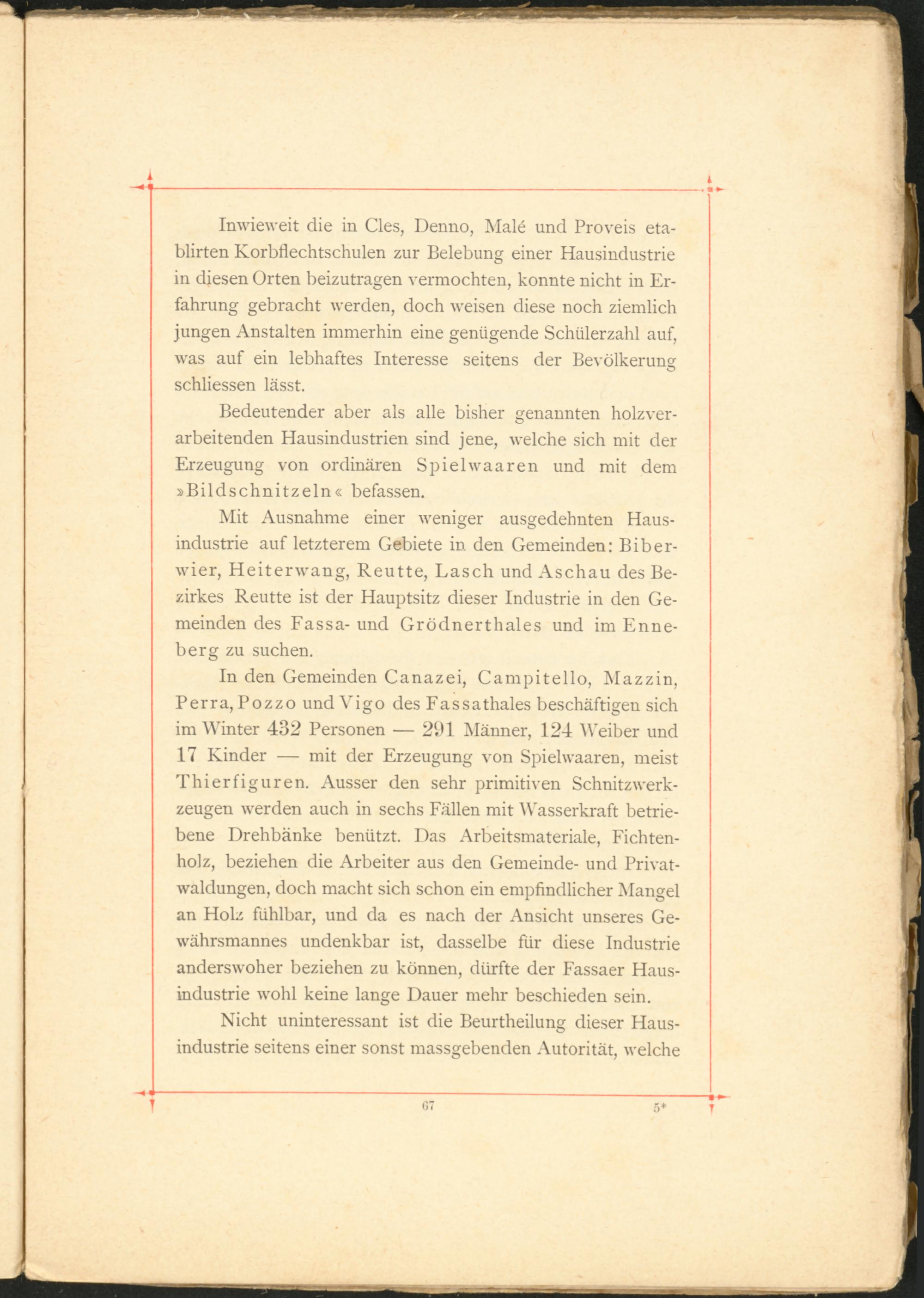 In den Gemeinden Canazei, Campitello, Mazzin, Perra, Pozzo und Vigo des Fassathales beschäftigen sich im Winter 432 Personen — 2 ( .)1 Männer, 124 Weiber und 17 Kinder — mit der Erzeugung von Spielwaaren, meist Thierfiguren. Ausser den sehr primitiven Schnitzwerkzeugen werden auch in sechs Fällen mit Wasserkraft betriebene Drehbänke benützt. Das Arbeitsmateriale, Fichtenholz, beziehen die Arbeiter aus den Gemeinde- und Privatwaldungen, doch macht sich schon ein empfindlicher Mangel an Holz fühlbar, und da es nach der Ansicht unseres Gewährsmannes undenkbar ist, dasselbe für diese Industrie anderswoher beziehen zu können, dürfte der Fassaer Hausindustrie wohl keine lange Dauer mehr beschieden sein.