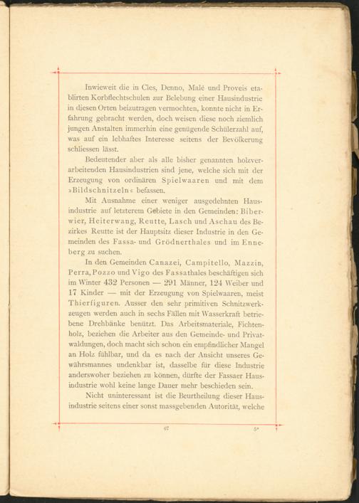Mit Ausnahme einer weniger ausgedehnten Hausindustrie auf letzterem Gebiete in den Gemeinden: Biber- wier, Heiterwang, Reutte, Lasch und Aschau des Bezirkes Reutte ist der Hauptsitz dieser Industrie in den Gemeinden des Fassa- und Grödnerthales und im Enne- berg zu suchen.