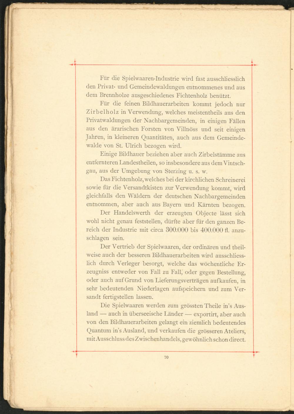 Für die feinen Bildhauerarbeiten kommt jedoch nur Zirbelholz in Verwendung, welches meistentheils aus den Privatwaldungen der Nachbargemeinden, in einigen Fällen aus den ärarischen Forsten von Villnöss und seit einigen Jahren, in kleineren Quantitäten, auch aus dem Gemeindewalde von St. Ulrich bezogen wird.