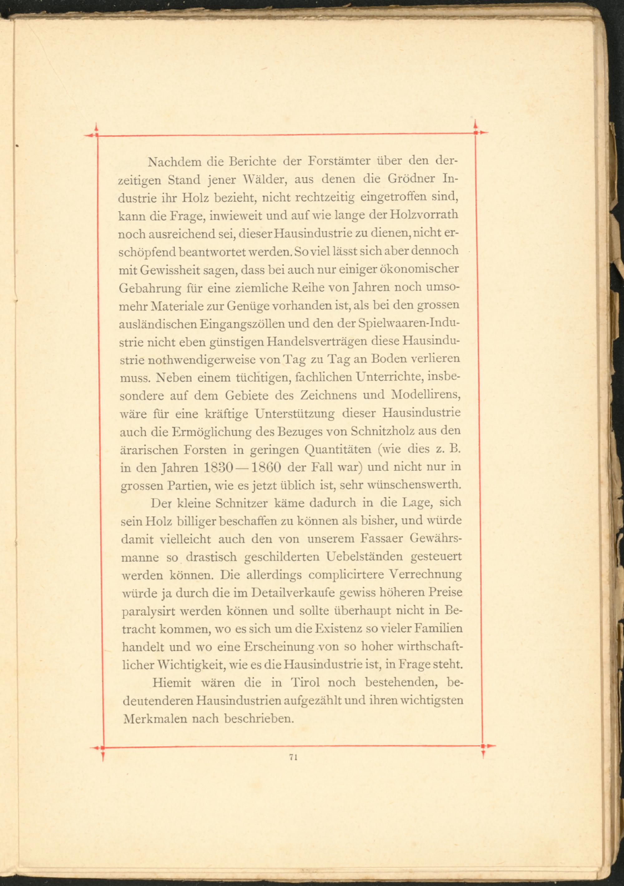Nachdem die Berichte der Forstämter über den derzeitigen Stand jener Wälder, aus denen die Grödner Industrie ihr Holz bezieht, nicht rechtzeitig eingetroffen sind, kann die Frage, inwieweit und auf wie lange der Holzvorrath noch ausreichend sei, dieser Hausindustrie zu dienen, nicht erschöpfend beantwortet werden. Soviel lässt sich aber dennoch mit Gewissheit sagen, dass bei auch nur einiger ökonomischer Gebahrung für eine ziemliche Reihe von Jahren noch umsomehr Materiale zur Genüge vorhanden ist, als bei den grossen ausländischen Eingangszöllen und den der Spielwaaren-Indu- strie nicht eben günstigen Handelsverträgen diese Hausindustrie nothwendigerweise von Tag zu Tag an Boden verlieren muss. Neben einem tüchtigen, fachlichen Unterrichte, insbesondere auf dem Gebiete des Zeichnens und Modellirens, wäre für eine kräftige Unterstützung dieser Hausindustrie auch die Ermöglichung des Bezuges von Schnitzholz aus den ärarischen Forsten in geringen Quantitäten (wie dies z. B. in den Jahren 1830 — 18G0 der Fall war) und nicht nur in grossen Partien, wie es jetzt üblich ist, sehr wünschenswerth.