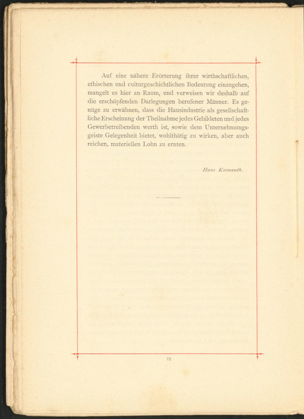 Auf eine nähere Erörterung ihrer wirtschaftlichen, ethischen und culturgeschichtlichen Bedeutung einzugehen, mangelt es hier an Raum, und verweisen wir deshalb auf die erschöpfenden Darlegungen berufener Männer. Es genüge zu erwähnen, dass die Hausindustrie als gesellschaftliche Erscheinung der Theilnahme jedes Gebildeten und jedes Gewerbetreibenden werth ist, sowie dem Unternehmungsgeiste Gelegenheit bietet, wohltätig zu wirken, aber auch reichen, materiellen Lohn zu ernten.