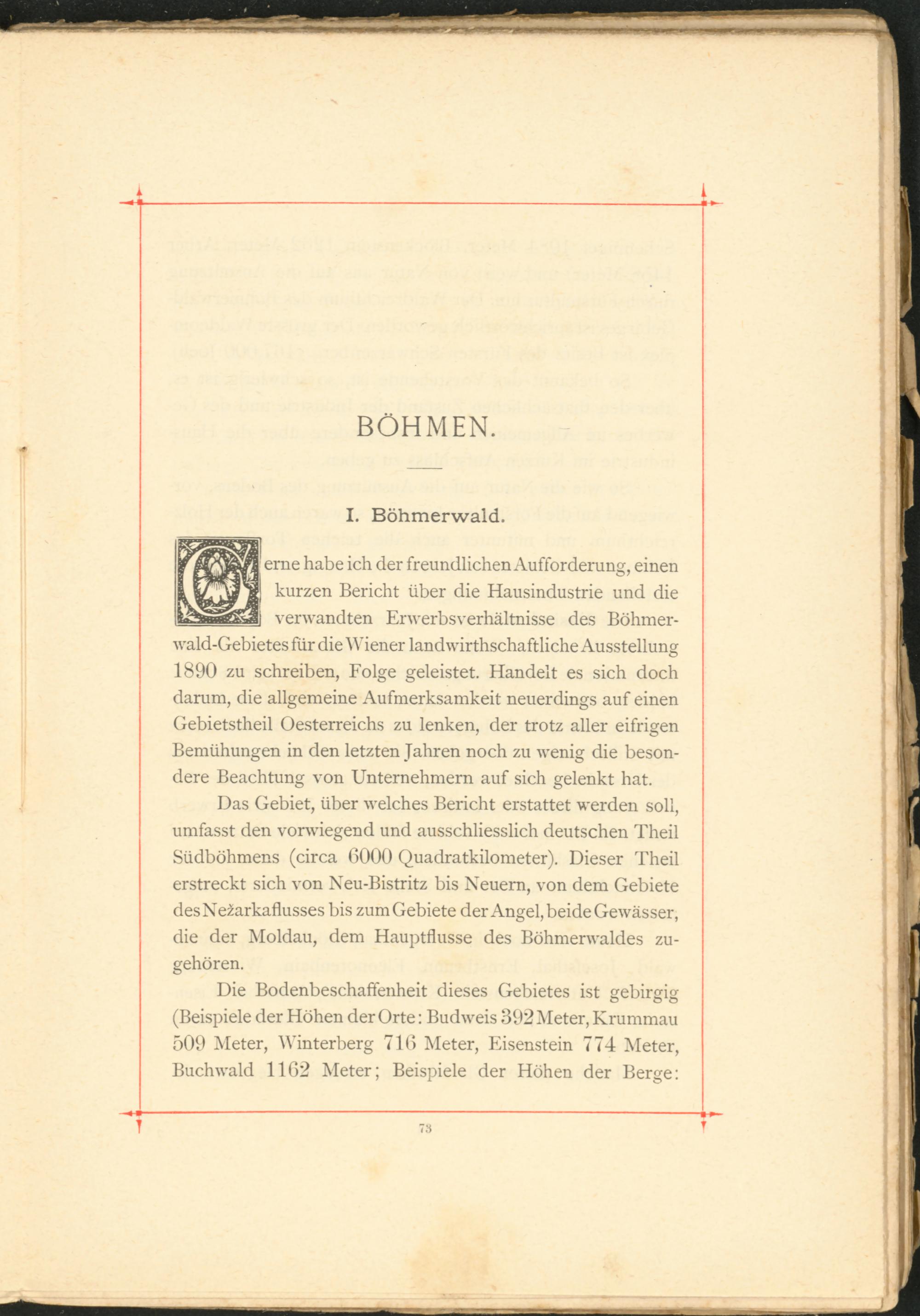 Das Gebiet, über welches Bericht erstattet werden soll, umfasst den vorwiegend und ausschliesslich deutschen Theil Südböhmens (circa 6000 Quadratkilometer). Dieser Theil erstreckt sich von Neu-Bistritz bis Neuem, von dem Gebiete desNe2arkaflusses bis zum Gebiete der Angel, beide Gewässer, die der Moldau, dem Hauptflusse des Böhmerwaldes zugehören.