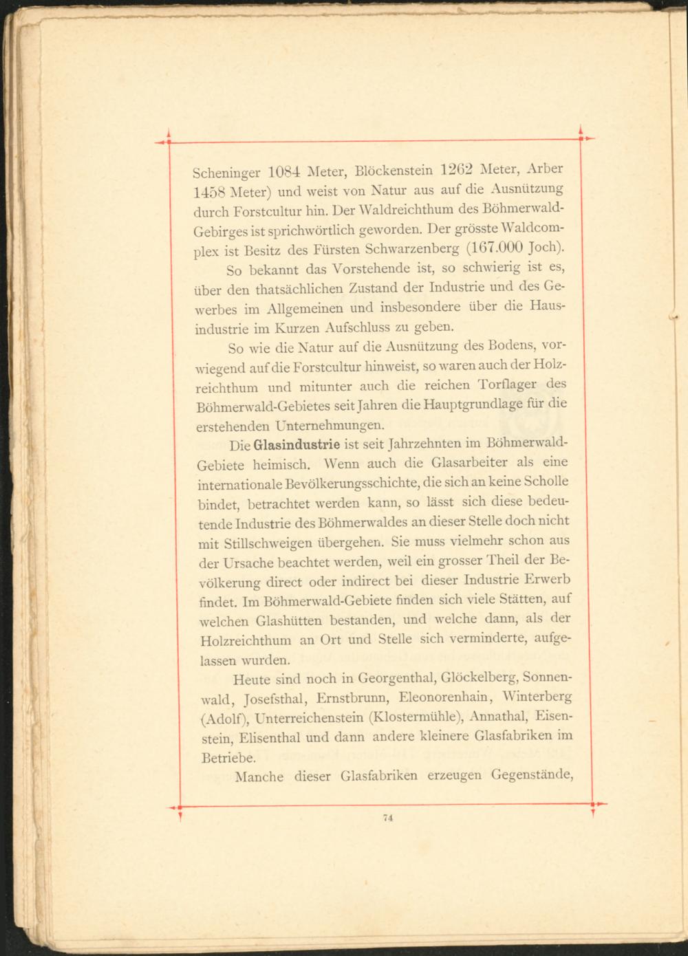 Die Glasindustrie ist seit Jahrzehnten im Böhmerwald- Gebiete heimisch. Wenn auch die Glasarbeiter als eine internationale Bevölkerungsschichte, die sich an keine Scholle bindet, betrachtet werden kann, so lässt sich diese bedeutende Industrie des Böhmerwaldes an dieser Stelle doch nicht mit Stillschweigen übergehen. Sie muss vielmehr schon aus der Ursache beachtet werden, weil ein grosser Theil der Bevölkerung direct oder indirect bei dieser Industrie Erwerb findet. Im Böhmerwald-Gebiete finden sich viele Stätten, auf welchen Glashütten bestanden, und welche dann, als der Holzreichthum an Ort und Stelle sich verminderte, aufgelassen wurden.