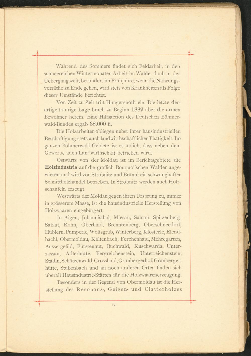 In Aigen, Johannisthal, Miesau, Salnau, Spitzenberg, Sablat, Rohn, Oberhaid, Brenntenberg, Oberschneedorf, Hüblern, Pumperle, Wolfsgrub, Winterberg, Klösterle, Elend- bachl, Obermoldau, Kaltenbach, Ferchenhaid, Mehregarten, Aussergefild, Fürstenhut, Buchwald, Kuschwarda, Unter- zassau, Adlerhütte, Bergreichenstein, Unterreichenstein, Stadln, Schätzenwald, Grosshaid, Grünbergerho f, Griinberger- hiitte, Stubenbach und an noch anderen Orten finden sich überall Hausindustrie-Stätten für die Holzwaarenerzeugung.