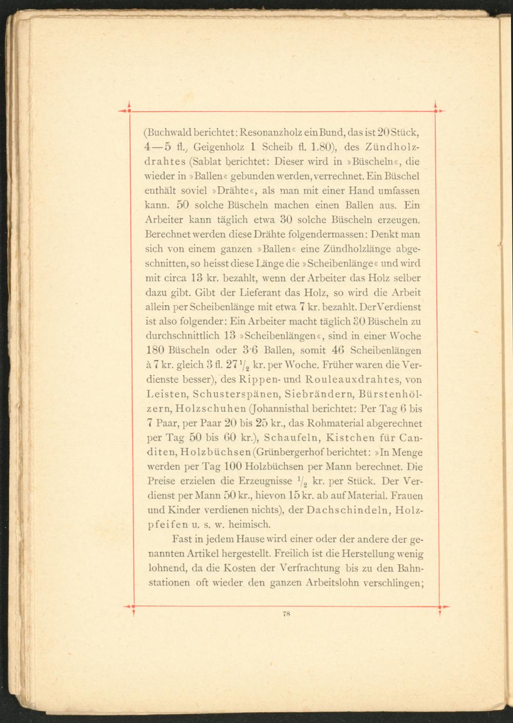 (Buchwald berichtet: Resonanzholz ein Bund, das ist 20 Stück, 4—5 fl., Geigenholz 1 Scheib fl. 1.80), des Zündholzdrahtes (Sablat berichtet: Dieser wird in »Büscheln«, die wieder in »Ballen« gebunden werden, verrechnet. Ein Büschel enthält soviel »Drähte«, als man mit einer Hand umfassen kann. 50 solche Büscheln machen einen Ballen aus. Ein Arbeiter kann täglich etwa 30 solche Büscheln erzeugen. Berechnet werden diese Drähte folgendermassen: Denkt man sich von einem ganzen »Ballen« eine Zündholzlänge abgeschnitten, so heisst diese Länge die »Scheibenlänge« und wird mit circa 13 kr. bezahlt, wenn der Arbeiter das Holz selber dazu gibt. Gibt der Lieferant das Holz, so wird die Arbeit allein per Scheibenlänge mit etwa 7 kr. bezahlt. Der Verdienst ist also folgender: Ein Arbeiter macht täglich 30 Büscheln zu durchschnittlich 13 »Scheibenlängen«, sind in einer Woche 180 Büscheln oder 36 Ballen, somit 46 Scheibenlängen ä 7 kr. gleich 3 fl. 27 1 / 2 kr. per Woche. Früher waren die Verdienste besser), des Rippen- und Rouleauxdrahtes, von Leisten, Schusterspänen, Siebrändern, Bürstenhölzern, Holzschuhen (Johannisthal berichtet: Per Tag 6 bis 7 Paar, per Paar 20 bis 25 kr., das Rohmaterial abgerechnet per Tag 50 bis 60 kr.), Schaufeln, Kistchen für Can- diten, Holzbüchsen (Grünbergerhof berichtet: »In Menge werden per Tag 100 Holzbüchsen per Mann berechnet. Die Preise erzielen die Erzeugnisse 1 / 2 kr. per Stück. Der Verdienst per Mann 50 kr., hievon 15 kr. ab auf Material. Frauen und Kinder verdienen nichts), der Dachschindeln, Holzpfeifen u. s. w. heimisch.
