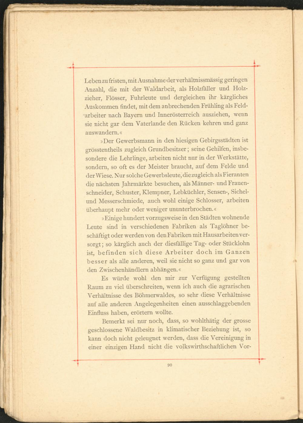 Leben zu fristen, mit Ausnahme der verhältnissmässig geringen Anzahl, die mit der Waldarbeit, als Holzfäller und Holzzieher, Flösser, Fuhrleute und dergleichen ihr kärgliches Auskommen findet, mit dem anbrechenden Frühling als Feld- ■arbeiter nach Bayern und Innerösterreich ausziehen, wenn sie nicht gar dem Vaterlande den Rücken kehren und ganz auswandern.«