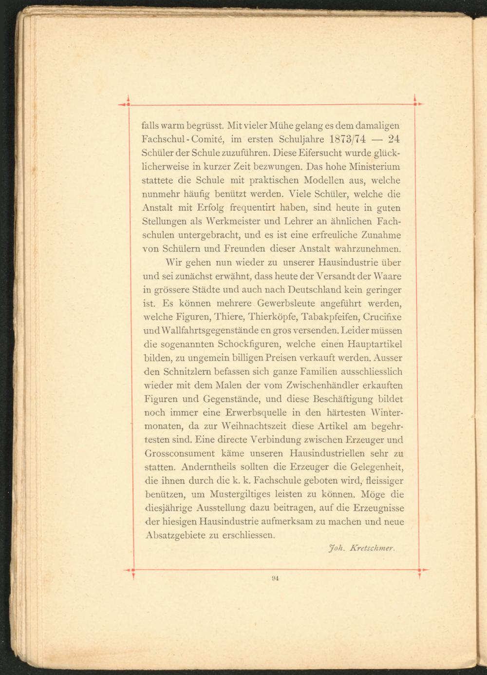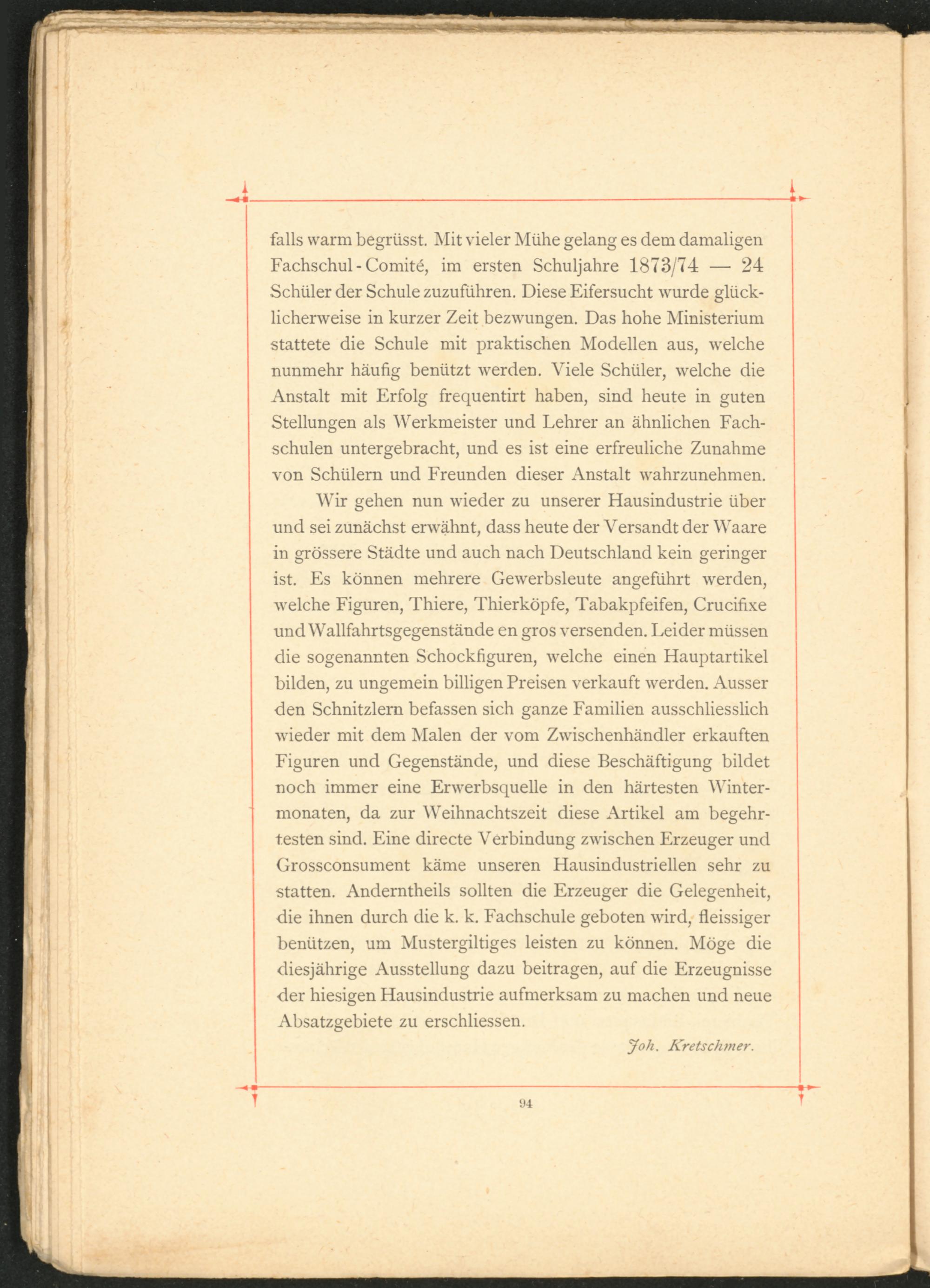 Wir gehen nun wieder zu unserer Hausindustrie über und sei zunächst erwähnt, dass heute der Versandt der Waare in grössere Städte und auch nach Deutschland kein geringer ist. Es können mehrere Gewerbsleute angeführt werden, welche Figuren, Thiere, Thierköpfe, Tabakpfeifen, Crucifixe und Wallfahrtsgegenstände en gros versenden. Leider müssen die sogenannten Schockfiguren, welche einen Hauptartikel bilden, zu ungemein billigen Preisen verkauft werden. Ausser den Schnitzlern befassen sich ganze Familien ausschliesslich wieder mit dem Malen der vom Zwischenhändler erkauften Figuren und Gegenstände, und diese Beschäftigung bildet noch immer eine Erwerbsquelle in den härtesten Wintermonaten, da zur Weihnachtszeit diese Artikel am begehrtesten sind. Eine directe Verbindung zwischen Erzeuger und Grossconsument käme unseren Hausindustriellen sehr zu statten. Anderntheils sollten die Erzeuger die Gelegenheit, die ihnen durch die k. k. Fachschule geboten wird, fleissiger benützen, um Mustergiltiges leisten zu können. Möge die diesjährige Ausstellung dazu beitragen, auf die Erzeugnisse der hiesigen Hausindustrie aufmerksam zu machen und neue Absatzgebiete zu erschliessen.