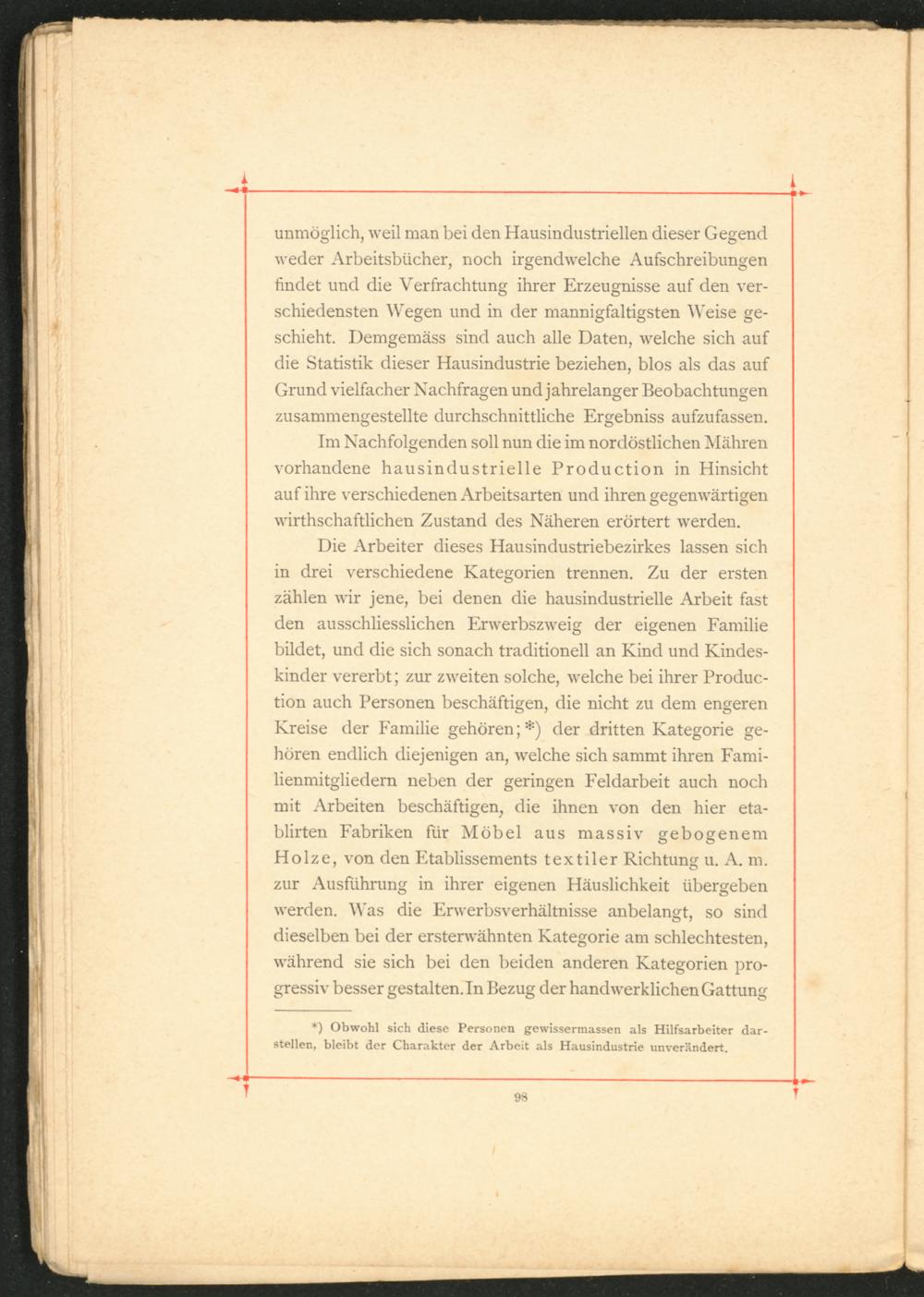Die Arbeiter dieses Hausindustriebezirkes lassen sich in drei verschiedene Kategorien trennen. Zu der ersten zählen wir jene, bei denen die hausindustrielle Arbeit fast den ausschliesslichen Erwerbszweig der eigenen Familie bildet, und die sich sonach traditionell an Kind und Kindeskinder vererbt; zur zweiten solche, welche bei ihrer Production auch Personen beschäftigen, die nicht zu dem engeren Kreise der Familie gehören;*) der dritten Kategorie gehören endlich diejenigen an, welche sich sammt ihren Familienmitgliedern neben der geringen Feldarbeit auch noch mit Arbeiten beschäftigen, die ihnen von den hier eta- blirten Fabriken für Möbel aus massiv gebogenem Holze, von den Etablissements textiler Richtung u. A. m. zur Ausführung in ihrer eigenen Häuslichkeit übergeben werden. Was die Erwerbsverhältnisse anbelangt, so sind dieselben bei der ersterwähnten Kategorie am schlechtesten, während sie sich bei den beiden anderen Kategorien progressiv besser gestalten. In Bezug der handwerklichen Gattung
