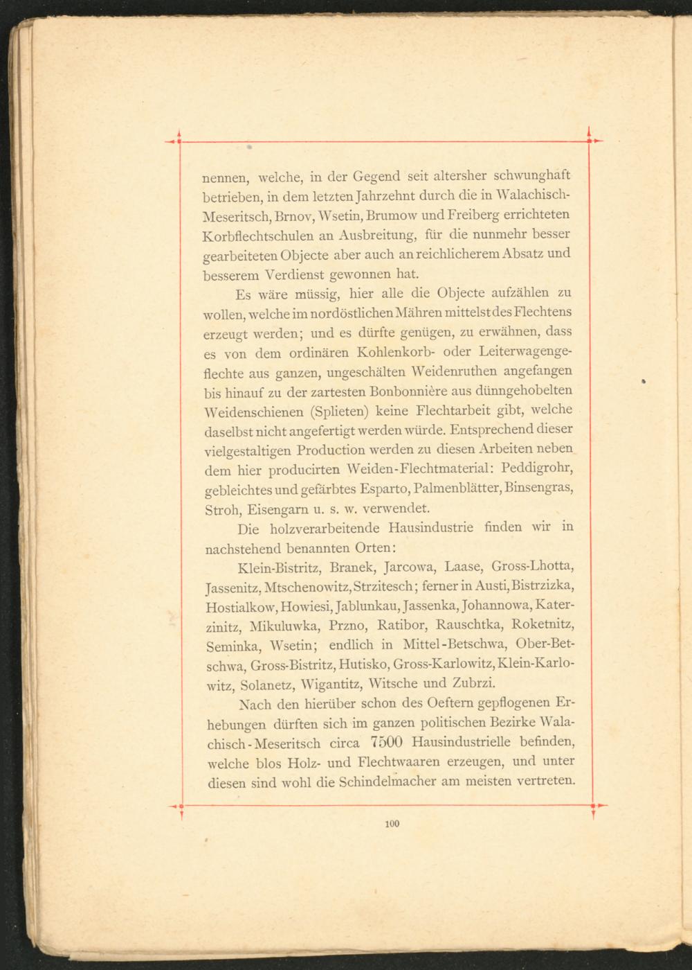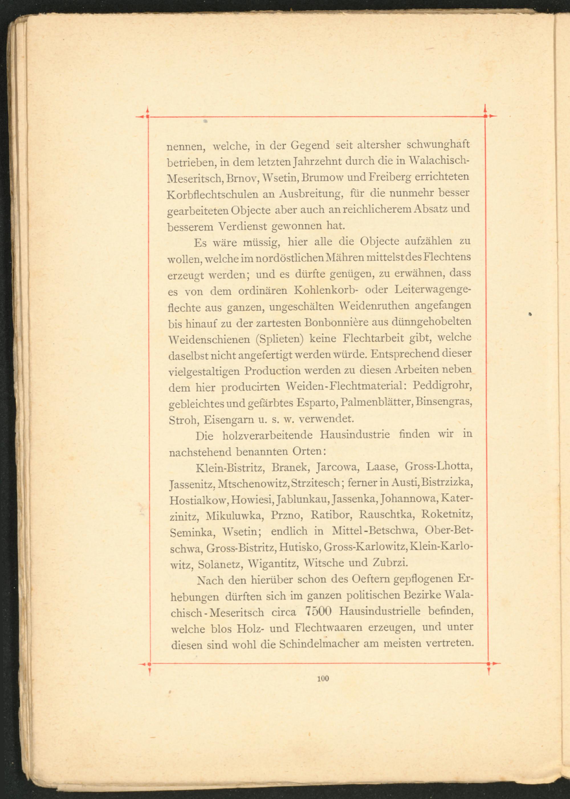 nennen, welche, in der Gegend seit altersher schwunghaft betrieben, in dem letzten Jahrzehnt durch die in Walachisch- Meseritsch, Brnov, Wsetin, Brumow und Freiberg errichteten Korbflechtschulen an Ausbreitung, für die nunmehr besser gearbeiteten Objecte aber auch an reichlicherem Absatz und besserem Verdienst gewonnen hat.