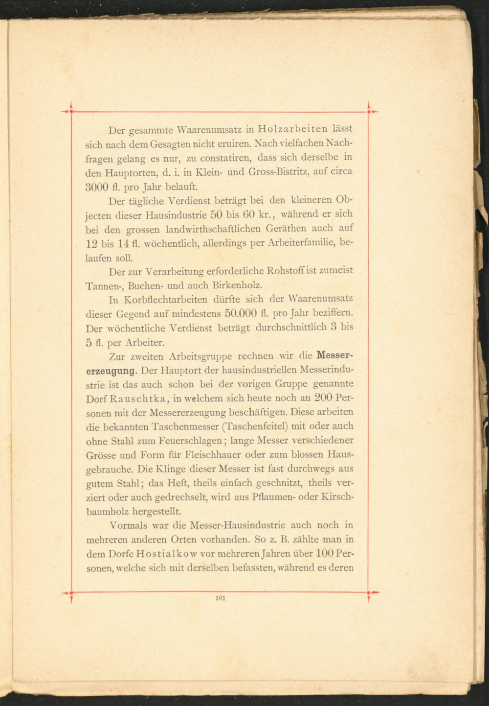 Der gesammte Waarenumsatz in Holzarbeiten lässt sich nach dem Gesagten nicht eruiren. Nach vielfachen Nachfragen gelang es nur, zu constatiren, dass sich derselbe in den Hauptorten, d. i. in Klein- und Gross-Bistritz, auf circa 3000 fl. pro Jahr belauft.