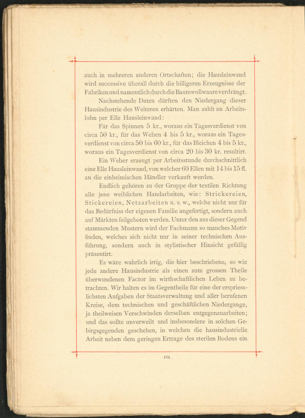 Es wäre wahrlich irrig, die hier beschriebene, so wie jede andere Hausindustrie als einen zum grossen Theile überwundenen Factor im wirthschaftlichen Leben zu betrachten. Wir halten es im Gegentheile für eine der erspriess- lichsten Aufgaben der Staatsverwaltung und aller berufenen Kreise, dem technischen und geschäftlichen Niedergange, ja theilweisen Verschwinden derselben entgegenzuarbeiten; und das sollte unverweilt und insbesondere in solchen Gebirgsgegenden geschehen, in welchen die hausindustrielle Arbeit neben dem geringen Ertrage des sterilen Bodens ein