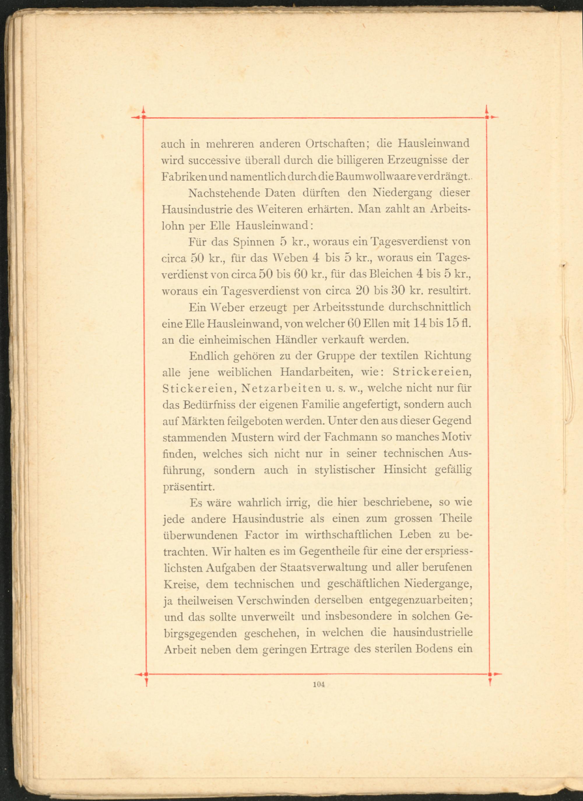 Ein Weber erzeugt per Arbeitsstunde durchschnittlich eine Elle Hausleinwand, von welcher 60 Ellen mit 14 bis 15 fl. an die einheimischen Händler verkauft werden.