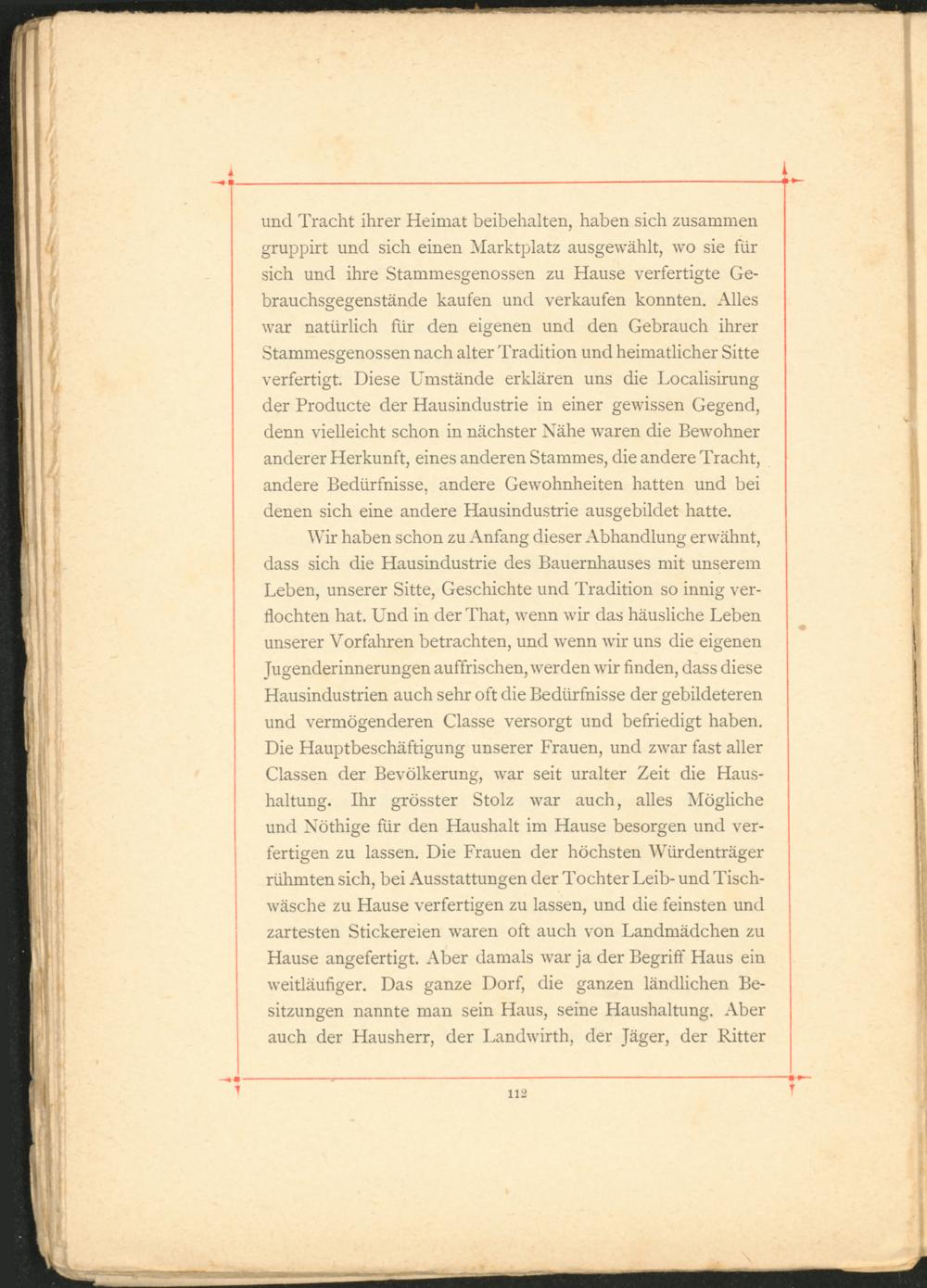 Wir haben schon zu Anfang dieser Abhandlung erwähnt, dass sich die Hausindustrie des Bauernhauses mit unserem Leben, unserer Sitte, Geschichte und Tradition so innig ver­flochten hat. Und in der That, wenn wir das häusliche Leben unserer Vorfahren betrachten, und wenn wir uns die eigenen Jugenderinnerungen auffrischen, werden wir finden, dass diese Hausindustrien auch sehr oft die Bedürfnisse der gebildeteren und vermögenderen Classe versorgt und befriedigt haben. Die Hauptbeschäftigung unserer Frauen, und zwar fast aller Classen der Bevölkerung, war seit uralter Zeit die Haus­haltung. Ihr grösster Stolz war auch, alles Mögliche und Nöthige für den Haushalt im Hause besorgen und ver­fertigen zu lassen. Die Frauen der höchsten Würdenträger rühmten sich, bei Ausstattungen der Tochter Leib- und Tisch­wäsche zu Hause verfertigen zu lassen, und die feinsten und zartesten Stickereien waren oft auch von Landmädchen zu Hause angefertigt. Aber damals war ja der Begriff Haus ein weitläufiger. Das ganze Dorf, die ganzen ländlichen Be­sitzungen nannte man sein Haus, seine Haushaltung. Aber auch der Hausherr, der Landwirth, der Jäger, der Ritter