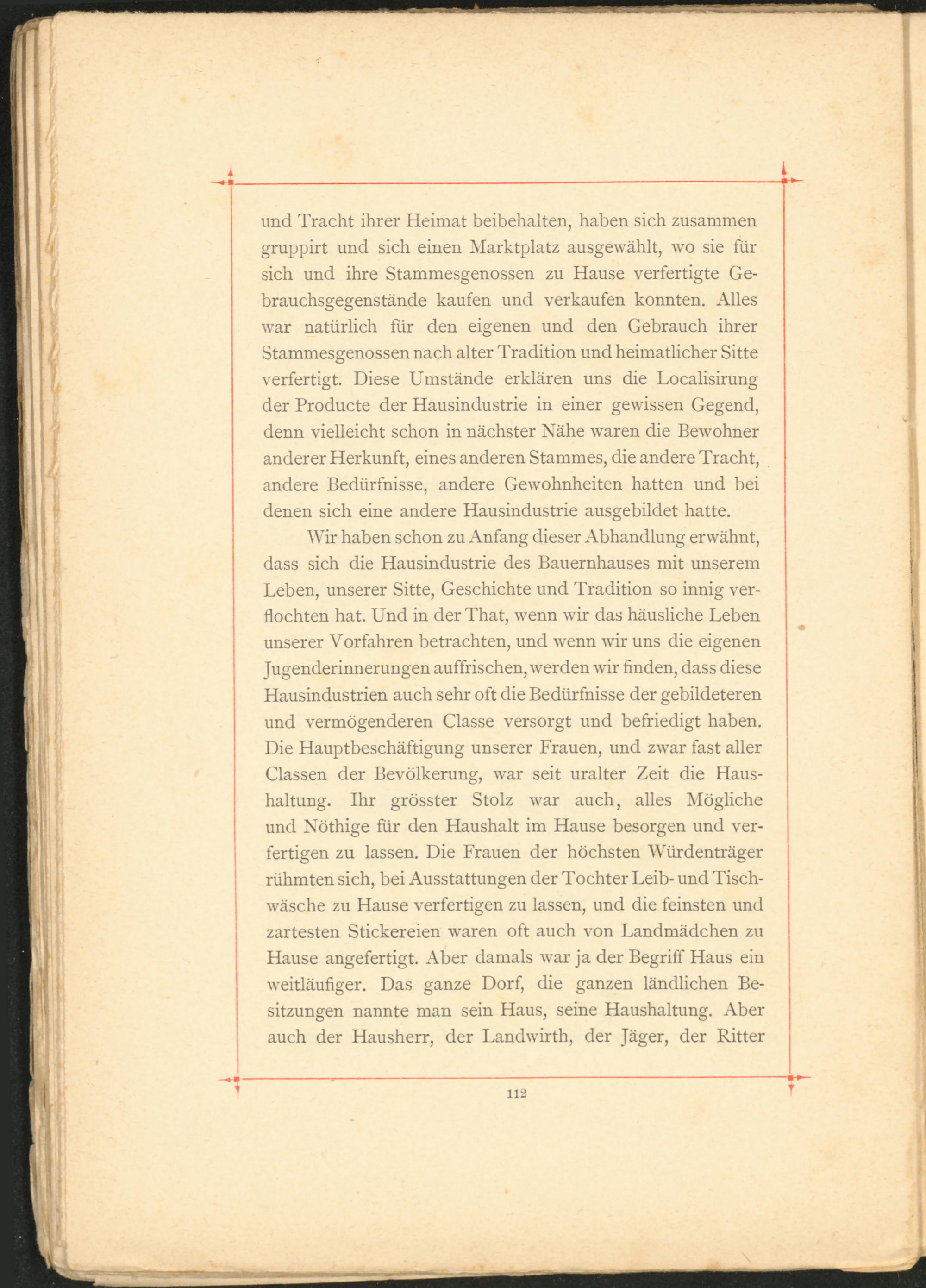 und Tracht ihrer Heimat beibehalten, haben sich zusammen gruppirt und sich einen Marktplatz ausgewählt, wo sie für sich und ihre Stammesgenossen zu Hause verfertigte Ge­brauchsgegenstände kaufen und verkaufen konnten. Alles war natürlich für den eigenen und den Gebrauch ihrer Stammesgenossen nach alter Tradition und heimatlicher Sitte verfertigt. Diese Umstände erklären uns die Localisirung der Producte der Hausindustrie in einer gewissen Gegend, denn vielleicht schon in nächster Nähe waren die Bewohner anderer Herkunft, eines anderen Stammes, die andere Tracht, andere Bedürfnisse, andere Gewohnheiten hatten und bei denen sich eine andere Hausindustrie ausgebildet hatte.