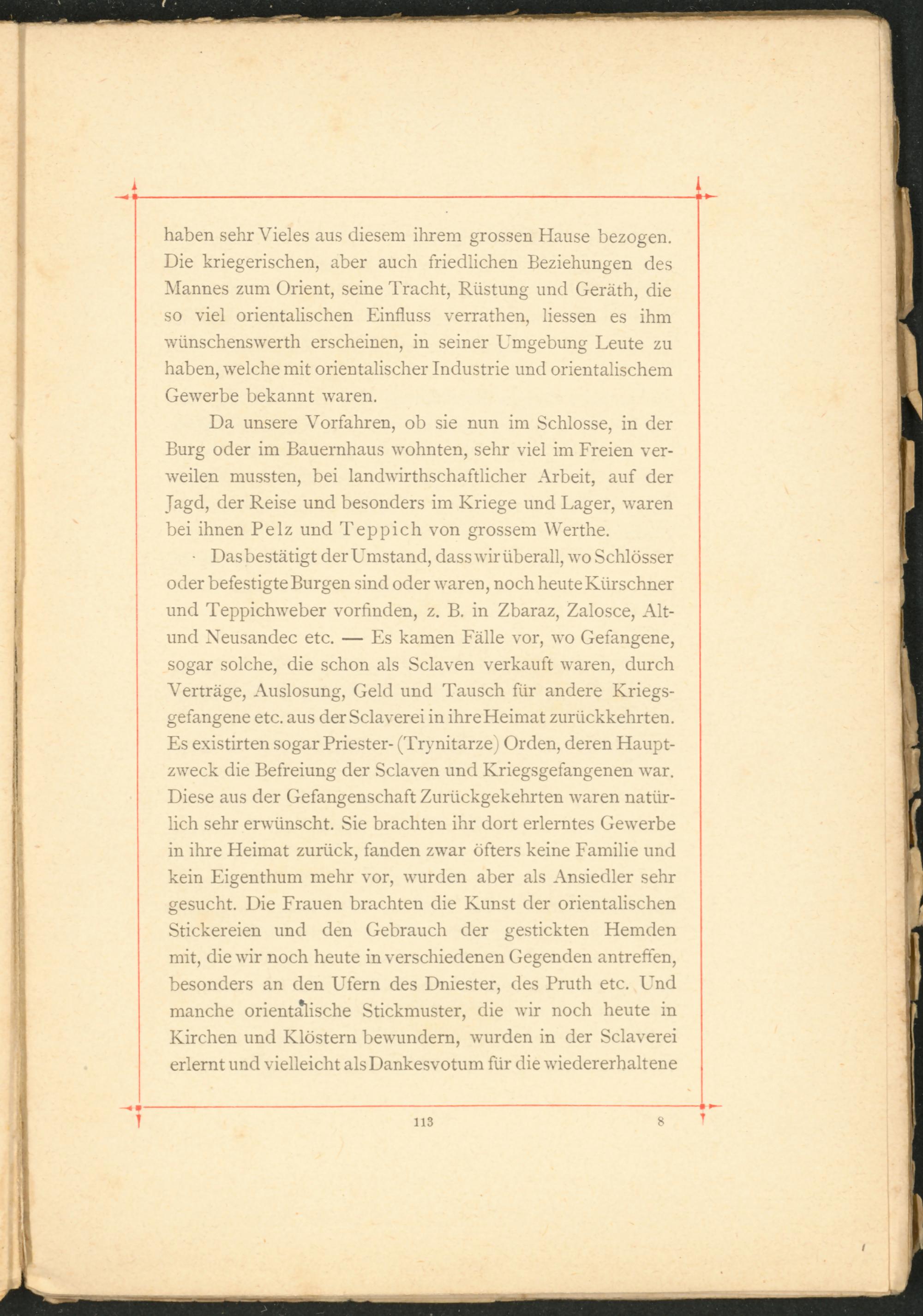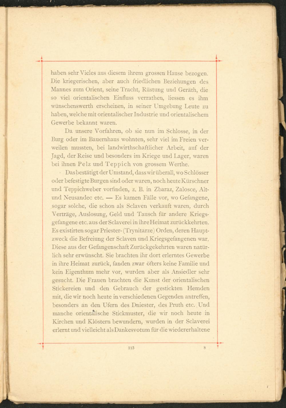 Dasbestätigt derUmstand, dass wir überall, wo Schlösser oder befestigte Burgen sind oder waren, noch heute Kürschner und Teppichweber vorfinden, z. B. in Zbaraz, Zalosce, Alt- und Neusandec etc. Es kamen Fälle vor, wo Gefangene, sogar solche, die schon als Sclaven verkauft waren, durch Verträge, Auslosung, Geld und Tausch für andere Kriegs­gefangene etc. aus der Sclaverei in ihre Heimat zurückkehrten. Es existirten sogar Priester- (Trynitarze) Orden, deren Haupt­zweck die Befreiung der Sclaven und Kriegsgefangenen war. Diese aus der Gefangenschaft Zurückgekehrten waren natür­lich sehr erwünscht. Sie brachten ihr dort erlerntes Gewerbe in ihre Heimat zurück, fanden zwar öfters keine Familie und kein Eigenthum mehr vor, wurden aber als Ansiedler sehr gesucht. Die Frauen brachten die Kunst der orientalischen Stickereien und den Gebrauch der gestickten Hemden mit, die wir noch heute in verschiedenen Gegenden antreffen, besonders an den Ufern des Dniester, des Pruth etc. Und manche orientalische Stickmuster, die wir noch heute in Kirchen und Klöstern bewundern, wurden in der Sclaverei erlernt und vielleicht als Dankesvotum für die wiedererhaltene