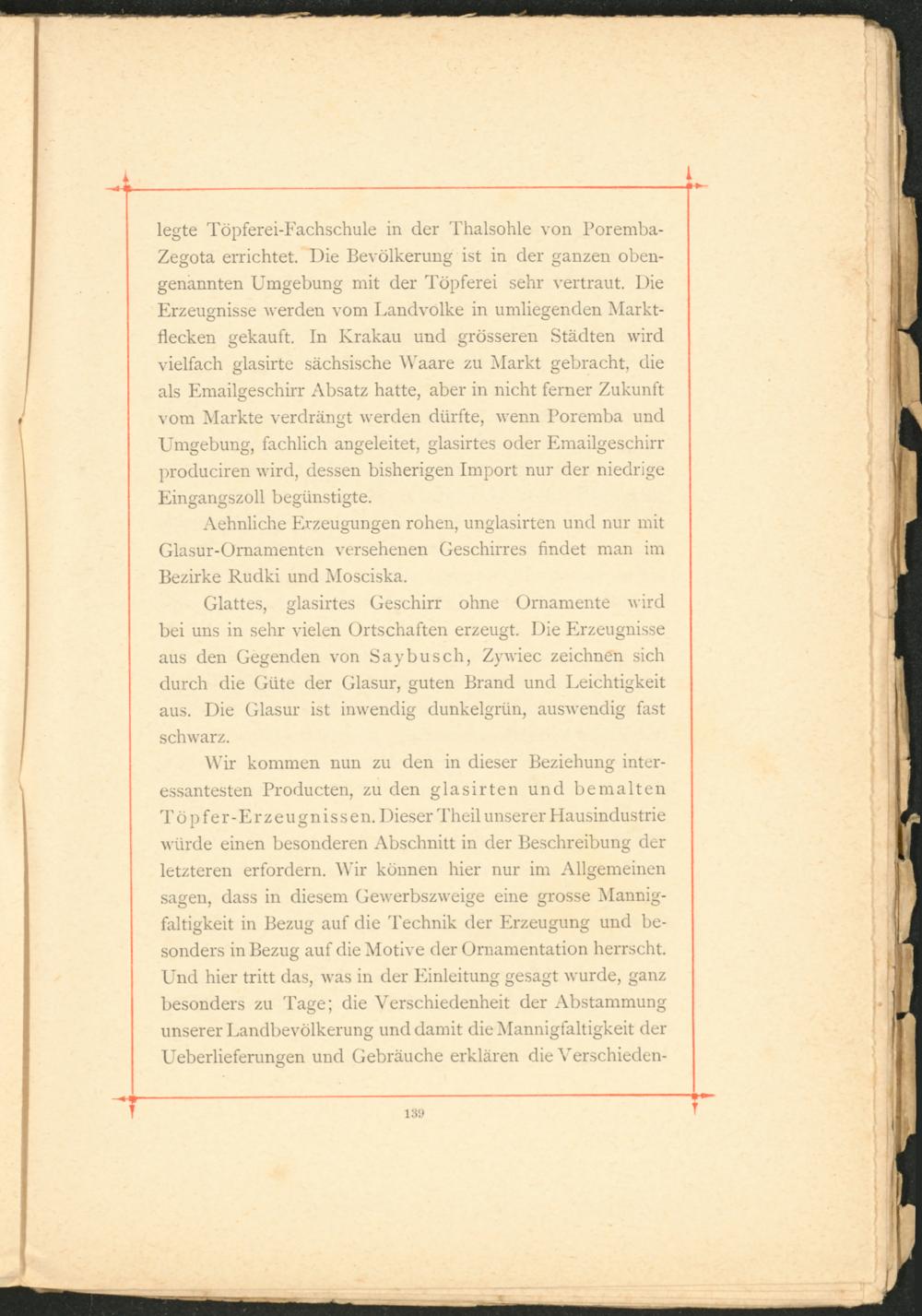 legte Töpferei-Fachschule in der Thalsohle von Poremba- Zegota errichtet. Die Bevölkerung ist in der ganzen obengenannten Umgebung mit der Töpferei sehr vertraut. Die Erzeugnisse werden vom Landvolke in umliegenden Marktflecken gekauft. In Krakau und grösseren Städten wird vielfach glasirte sächsische Waare zu Markt gebracht, die als Emailgeschirr Absatz hatte, aber in nicht ferner Zukunft vom Markte verdrängt werden dürfte, wenn Poremba und Umgebung, fachlich angeleitet, glasirtes oder Emailgeschirr produciren wird, dessen bisherigen Import nur der niedrige Eingangszoll begünstigte.