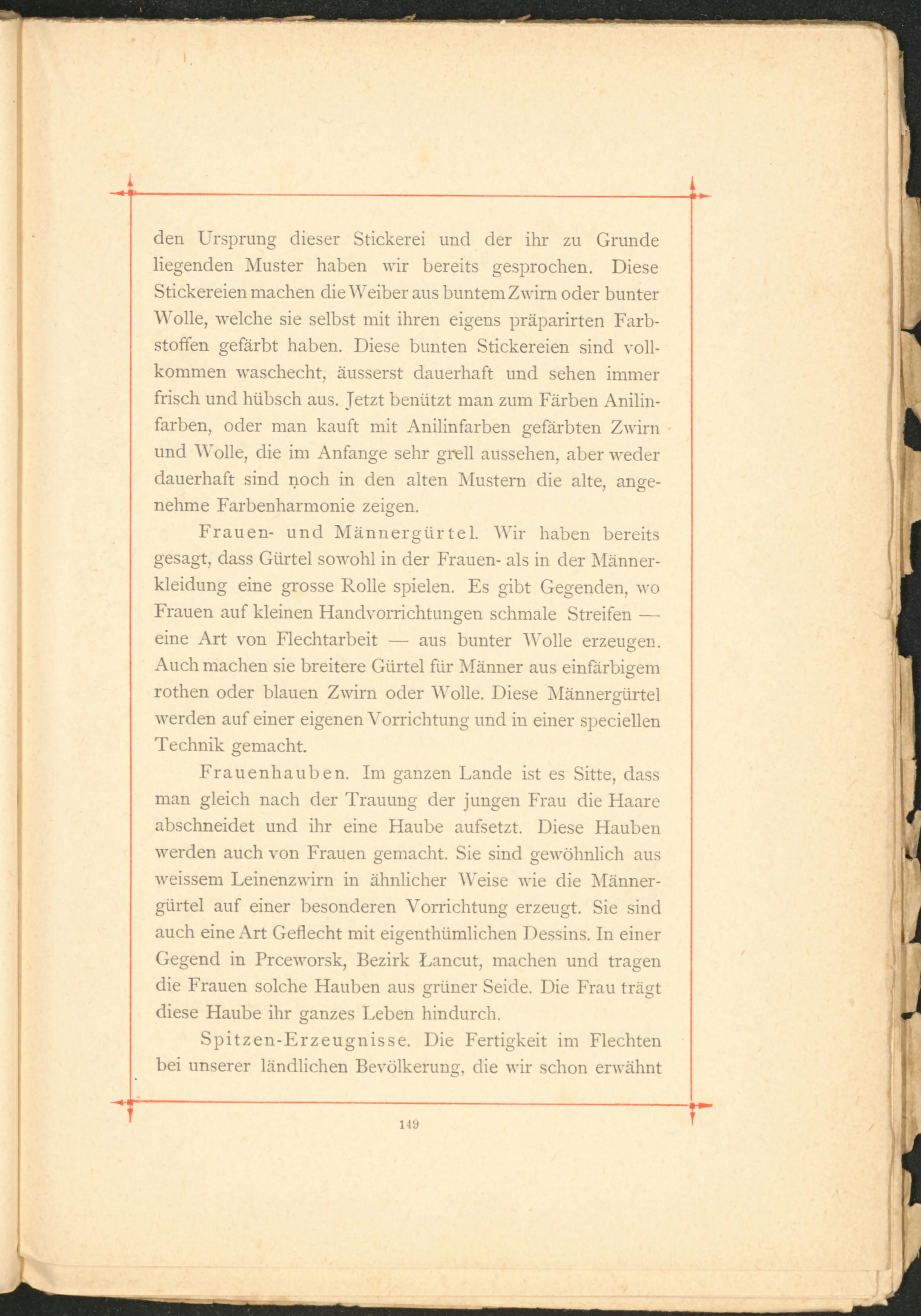 den Ursprung dieser Stickerei und der ihr zu Grunde liegenden Muster haben wir bereits gesprochen. Diese Stickereien machen die Weiber aus buntem Zwirn oder bunter Wolle, welche sie selbst mit ihren eigens präparirten Farbstoffen gefärbt haben. Diese bunten Stickereien sind vollkommen waschecht, äusserst dauerhaft und sehen immer frisch und hübsch aus. Jetzt benützt man zum Färben Anilinfarben, oder man kauft mit Anilinfarben gefärbten Zwirn und Wolle, die im Anfänge sehr grell aussehen, aber weder dauerhaft sind noch in den alten Mustern die alte, angenehme Farbenharmonie zeigen.