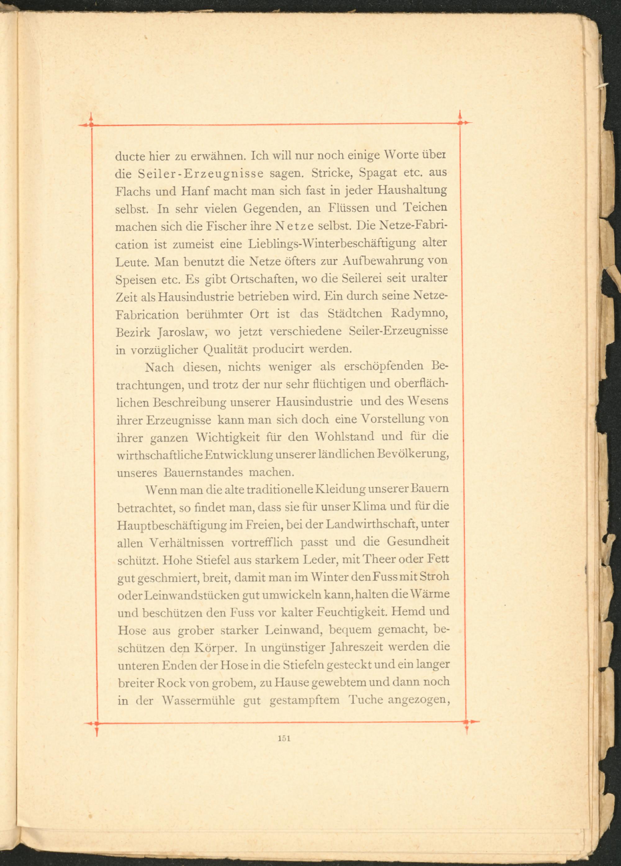 ducte hier zu erwähnen. Ich will nur noch einige Worte über die Seiler-Erzeugnisse sagen. Stricke, Spagat etc. aus Flachs und Hanf macht man sich fast in jeder Haushaltung selbst. In sehr vielen Gegenden, an Flüssen und Teichen machen sich die Fischer ihre Netze selbst. Die Netze-Fabri- cation ist zumeist eine Lieblings-Winterbeschäftigung alter Leute. Man benutzt die Netze öfters zur Aufbewahrung von Speisen etc. Es gibt Ortschaften, wo die Seilerei seit uralter Zeit als Hausindustrie betrieben wird. Ein durch seine Netze- Fabrication berühmter Ort ist das Städtchen Radymno, Bezirk Jaroslaw, wo jetzt verschiedene Seiler-Erzeugnisse in vorzüglicher Qualität producirt werden.