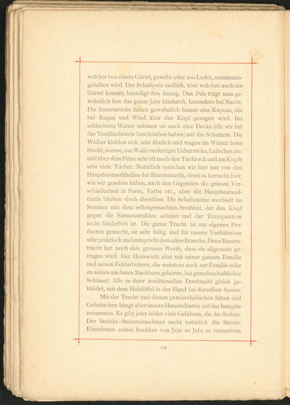 Mit der Tracht und diesen patriarchalischen Sitten und Gebräuchen hängt aber unsere Hausindustrie auf das Innigste zusammen. Es gibt jetzt leider viele Gefahren, die ihr drohen. Der Bezirks - Steuereinnehmer sucht natürlich die Steuer- Einnahmen seines Bezirkes von Jahr zu Jahr zu vermehren