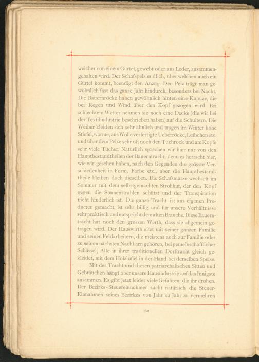 welcher von einem Gürtel, gewebt oder aus Leder, zusammengehalten wird. Der Schafspelz endlich, über welchen auch ein Gürtel kommt, beendigt den Anzug. Den Pelz trägt man gewöhnlich fast das ganze Jahr hindurch, besonders bei Nacht. Die Bauernröcke haben gewöhnlich hinten eine Kapuze, die bei Regen und Wind über den Kopf gezogen wird. Bei schlechtem Wetter nehmen sie noch eine Decke (die wir bei der Textilindustrie beschrieben haben) auf die Schultern. Die Weiber kleiden sich sehr ähnlich und tragen im Winter hohe Stiefel, warme, aus Wolle verfertigte Ueberröcke, Leibchen etc. und über dem Pelze sehr oft noch den Tuchrock und am Kopfe sehr viele 'Bücher. Natürlich sprechen wir hier nur von den Hauptbestandtheilen der Bauerntracht, denn es herrscht hier, wie wir gesehen haben, nach den Gegenden die grösste Verschiedenheit in Form, Farbe etc., aber die Hauptbestand- theile bleiben doch dieselben. Die Schafsmütze wechselt im Sommer mit dem selbstgemachten Strohhut, der den Kopf gegen die Sonnenstrahlen schützt und der Transpiration nicht hinderlich ist. Die ganze Tracht ist aus eigenen Pro- ducten gemacht, ist sehr billig und für unsere Verhältnisse sehr praktisch und entspricht dem alten Brauche. Diese Bauerntracht hat noch den grossen Werth, dass sie allgemein getragen wird. Der Hauswirth sitzt mit seiner ganzen Familie und seinen Feldarbeitern, die meistens auch zur Familie oder zu seinen nächsten Nachbarn gehören, bei gemeinschaftlicher Schüssel; Alle in ihrer traditionellen Dorftracht gleich gekleidet, mit dem Holzlöffel in der Hand bei derselben Speise.