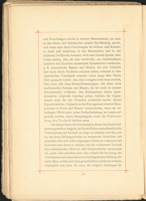 Ich unterschätze die Schwierigkeit dieser den Fachschullehrern gestellten Aufgabe, bei ihrem Wirken ausschliesslich die Verbesserung der Technik im Auge zu behalten und das, was sie aus ihren Bildungsschulen an artistischer Schablone mit gebracht oder sich selbst angeeignet haben, zu vergessen und höchstens nur daran zu denken, wie die verbesserte Technik den einheimischen Motiven und Kohproducten anzupassen sei, nicht; dies erfordert eben eine scharfe Beobachtung der Verhältnisse und einen höheren Grad allgemeiner Bildung, der nicht Allen, welche sich dem gewerblichen Lehrfache widmen, zugänglich sein kann. Es muss die Aufgabe derjenigen In-