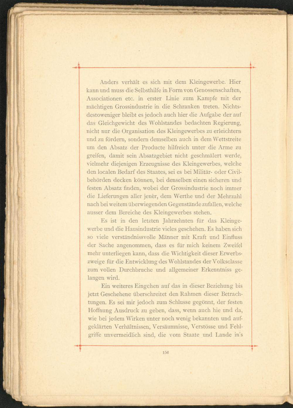 Es ist in den letzten Jahrzehnten für das Kleingewerbe und die Hausindustrie vieles geschehen. Es haben sich so viele verständnisvolle Männer mit Kraft und Einfluss der Sache angenommen, dass es für mich keinem Zweifel mehr unterliegen kann, dass die Wichtigkeit dieser Erwerbszweige für die Entwicklung des Wohlstandes der Volksclasse zum vollen Durchbruche und allgemeiner Erkenntniss gelangen wird.