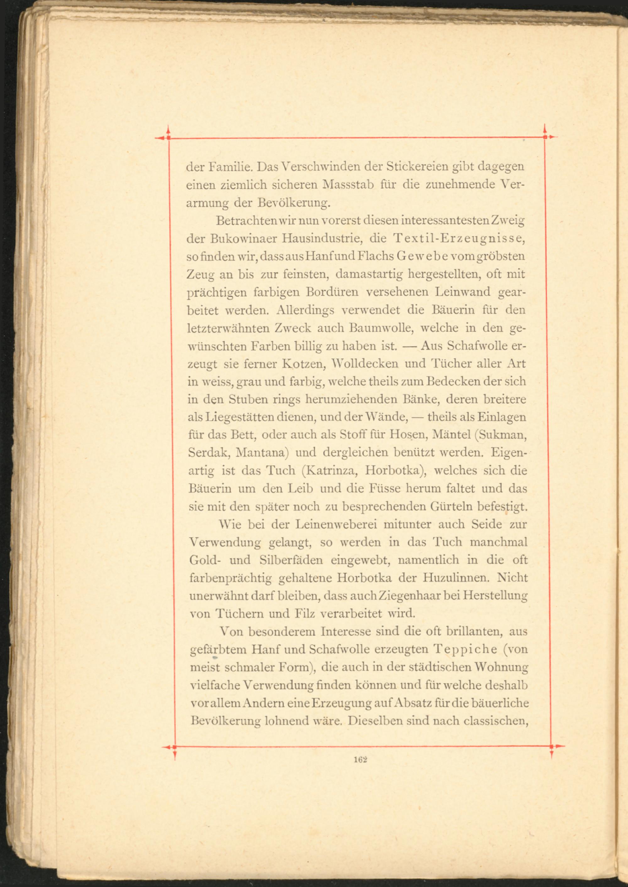 Betrachten wir nun vorerst diesen interessantesten Zweig der Bukowinaer Hausindustrie, die Textil-Erzeugnisse, so finden wir, dass aus Hanf und Flachs Gewebe vom gröbsten Zeug an bis zur feinsten, damastartig hergestellten, oft mit prächtigen farbigen Bordüren versehenen Leinwand gear­beitet werden. Allerdings verwendet die Bäuerin für den letzterwähnten Zweck auch Baumwolle, welche in den ge­wünschten Farben billig zu haben ist. Aus Schafwolle er­zeugt sie ferner Kotzen, Wolldecken und Tücher aller Art in weiss, grau und farbig, welche theils zum Bedecken der sich in den Stuben rings herumziehenden Bänke, deren breitere als Liegestätten dienen, und der Wände, theils als Einlagen für das Bett, oder auch als Stoff für Hosen, Mäntel (Sukman, Serdak, Mantana) und dergleichen benützt werden. Eigen­artig ist das Tuch (Katrinza, Horbotka), welches sich die Bäuerin um den Leib und die Ftisse herum faltet und das sie mit den später noch zu besprechenden Gürteln befestigt.
