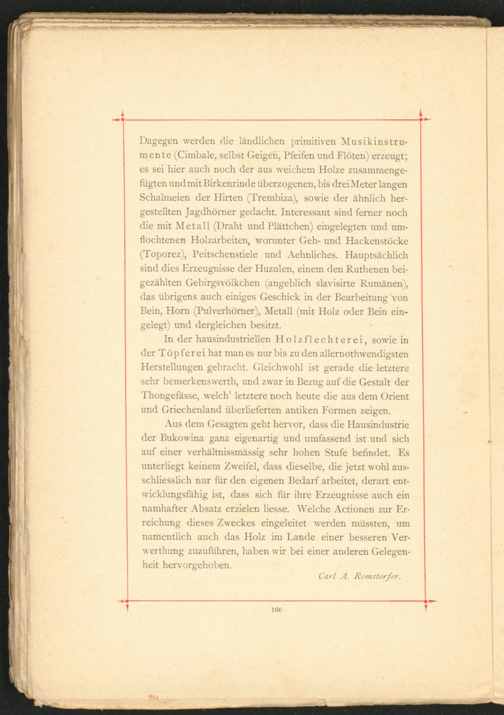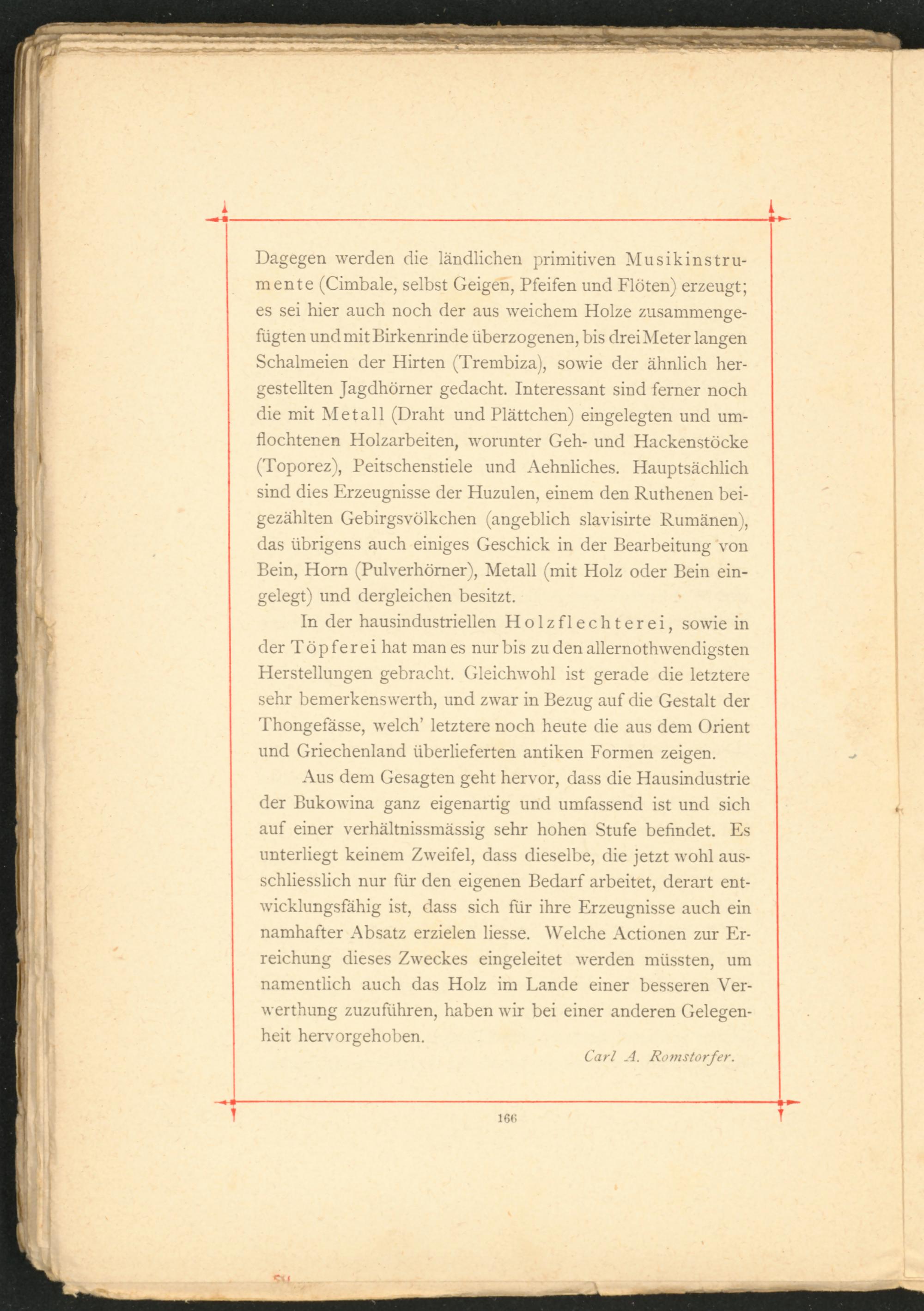 Aus dem Gesagten geht hervor, dass die Hausindustrie der Bukowina ganz eigenartig und umfassend ist und sich auf einer verhältnissmässig sehr hohen Stufe befindet. Es unterliegt keinem Zweifel, dass dieselbe, die jetzt wohl ausschliesslich nur für den eigenen Bedarf arbeitet, derart entwicklungsfähig ist, dass sich für ihre Erzeugnisse auch ein namhafter Absatz erzielen liesse. Welche Actionen zur Erreichung dieses Zweckes eingeleitet werden müssten, um namentlich auch das Holz im Lande einer besseren Ver- werthung zuzuführen, haben wir bei einer anderen Gelegenheit hervorgehoben.
