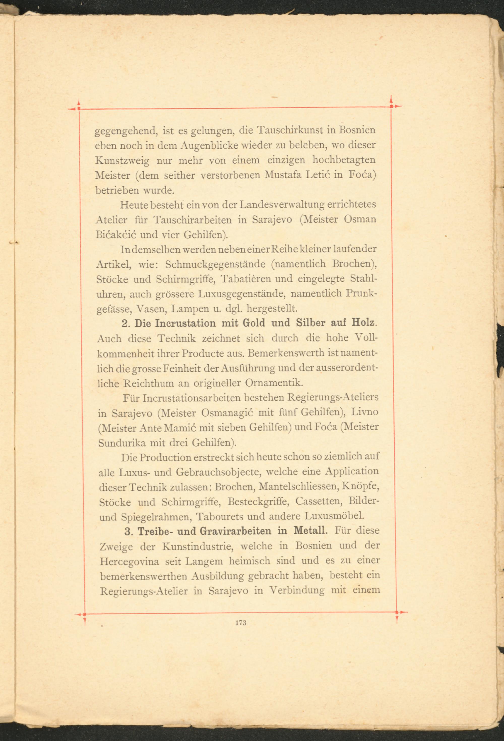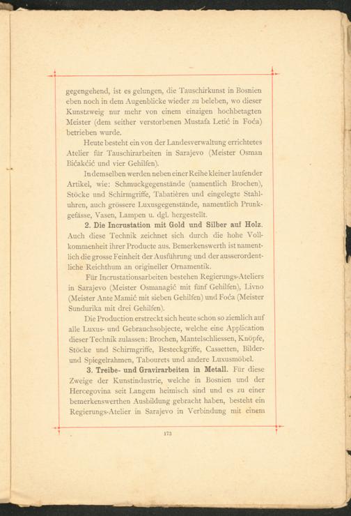 Für Incrustationsarbeiten bestehen Regierungs-Ateliers in Sarajevo (Meister Osmanagic mit fünf Gehilfen), Livno (Meister Ante Mamic mit sieben Gehilfen) und Foca (Meister Sundurika mit drei Gehilfen).