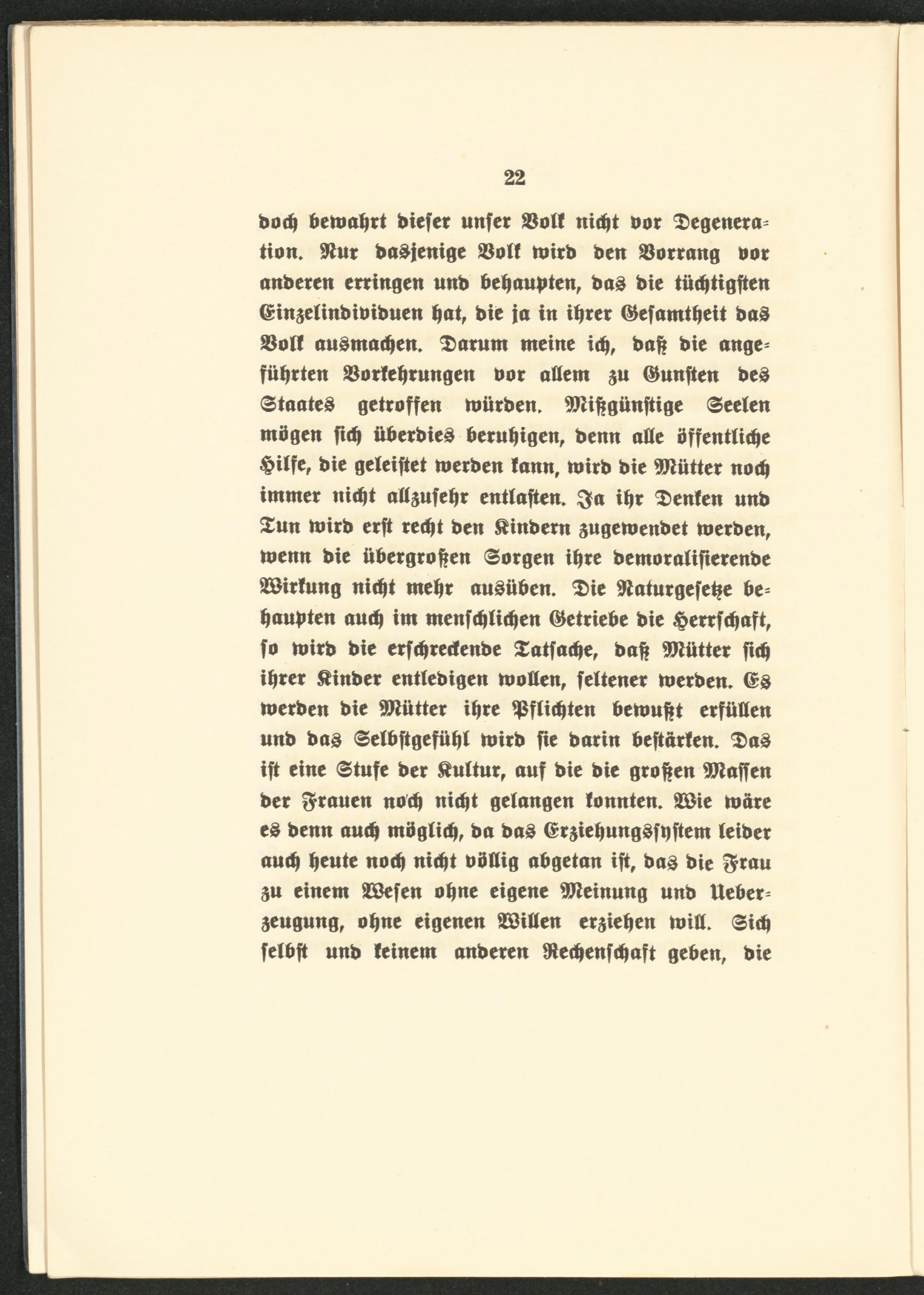 hoch bemahrt biefer nufer SSotl nicht bot Degenera= tion. 9fcur bagjenige aSolf mirb beit Vorrang bot anbeten erringen nnb beraubten, bag bie tücbtigßen ©injelinbioibuen bat, bie ja in ihrer ©efamtheü bag aJol l augmacljen. Darum meine ich, baß bie ange* führten aSorfehrungen bor attem jn (fünften beg (Staateg getroffen mürben. 9JUßgünftige Seelen mögen ftcb überbieg beruhigen, benn alle öffentliche $üfe, bie geleiftet merben fann, mirb bie Mütter noch immer nicht att^ufehr entlaßen. $fa ihr Deuten unb Dun mirb erb recht ben ^inbern gugemenbet merben, menu bie übergroßen Sorgen ihre bemoralifterenbe aBirlung nicht mehr augüben. Die 9taturgefeße behaupten auch im menfchlichen (betriebe bie £errfchaft, fo mirb bie erfchrecfenbe Datfache, baß Mütter fich ihrer SHnber enttebigen motten, feltener merben. 6g merben bie SRütter ihre Pflichten bemußt erfüllen unb bag Selbftgefühl mirb fie barin beßarfen. Dag iß eine Stufe ber Kultur, auf bie bie großen haften ber grauen noch nicht gelangen lonnten. aBie märe eg benn auch möglich, ba bag 6r$iehunggfbßem leiber auch ß^ute noch nicht böttig abgetan iß, bag bie f?rau 5 u einem SBefen ohne eigene Meinung unb Ueber- jeuguitg, ohne eigenen ^Bitten ergeben mill. Sich felbß nnb feinem anberen SRechenfcßaft geben, bie