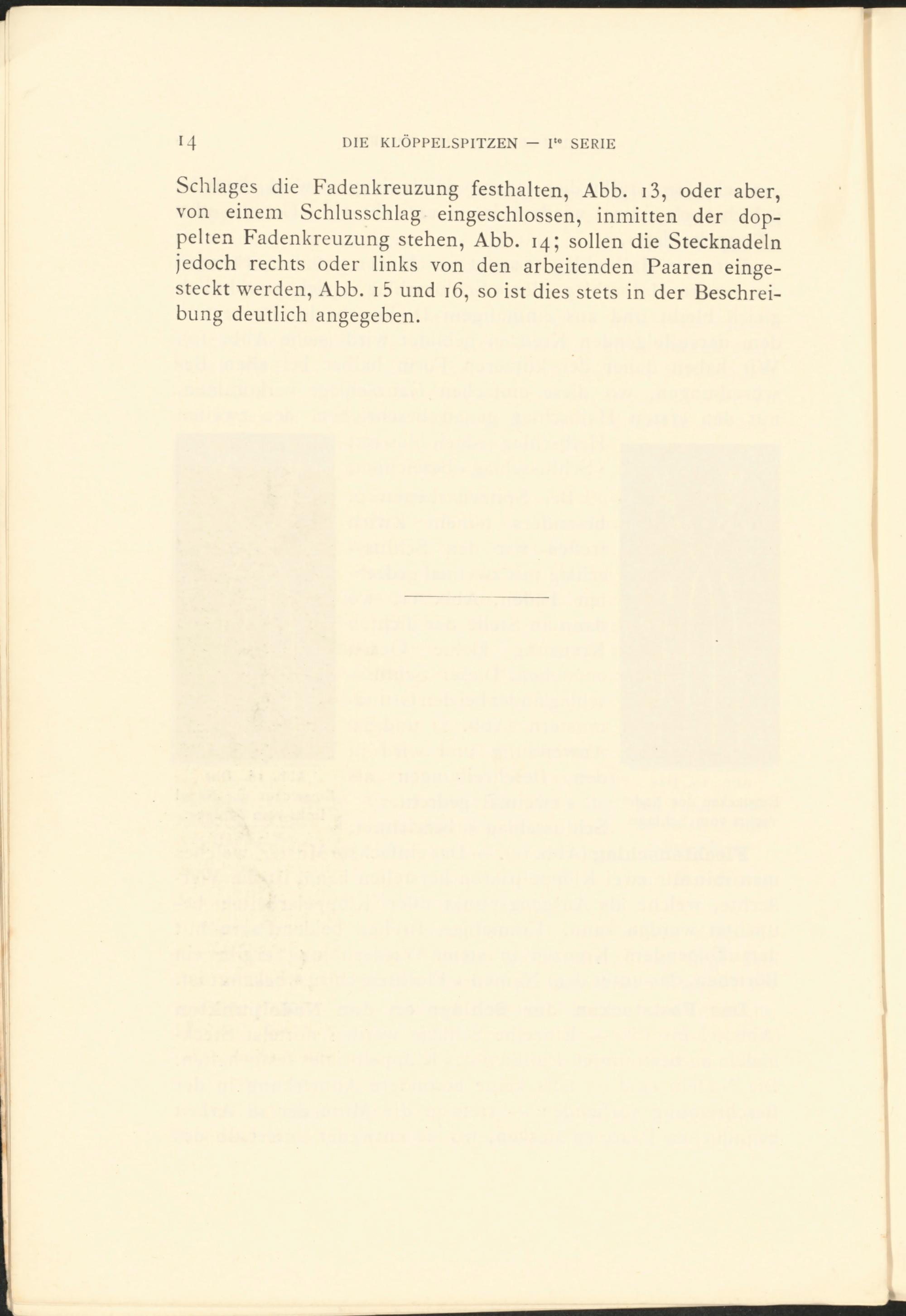 Schlages die Fadenkreuzung festhalten, Abb. 1 3 , oder aber, von einem Schlusschlag eingeschlossen, inmitten der doppelten Fadenkreuzung stehen, Abb. 14; sollen die Stecknadeln jedoch rechts oder links von den arbeitenden Paaren eingesteckt werden, Abb. i 5 und 16, so ist dies stets in der Beschreibung deutlich angegeben.