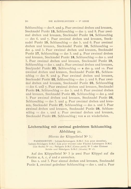 FADENSORTEN : Leinen-Spitzengarn D.M.C (Lin pour dentelles), Leinen-Strickgarn D.M.C (Lin pour tricoter) oder Flaches Leinengarn D.M.C (Lin floche) N° 12 ; Perlgarn D.M.C (Coton perlé) N“ 5 oder Elsässer Strick-und Häkelgarn D.M.C (Alsatia) N° i5.